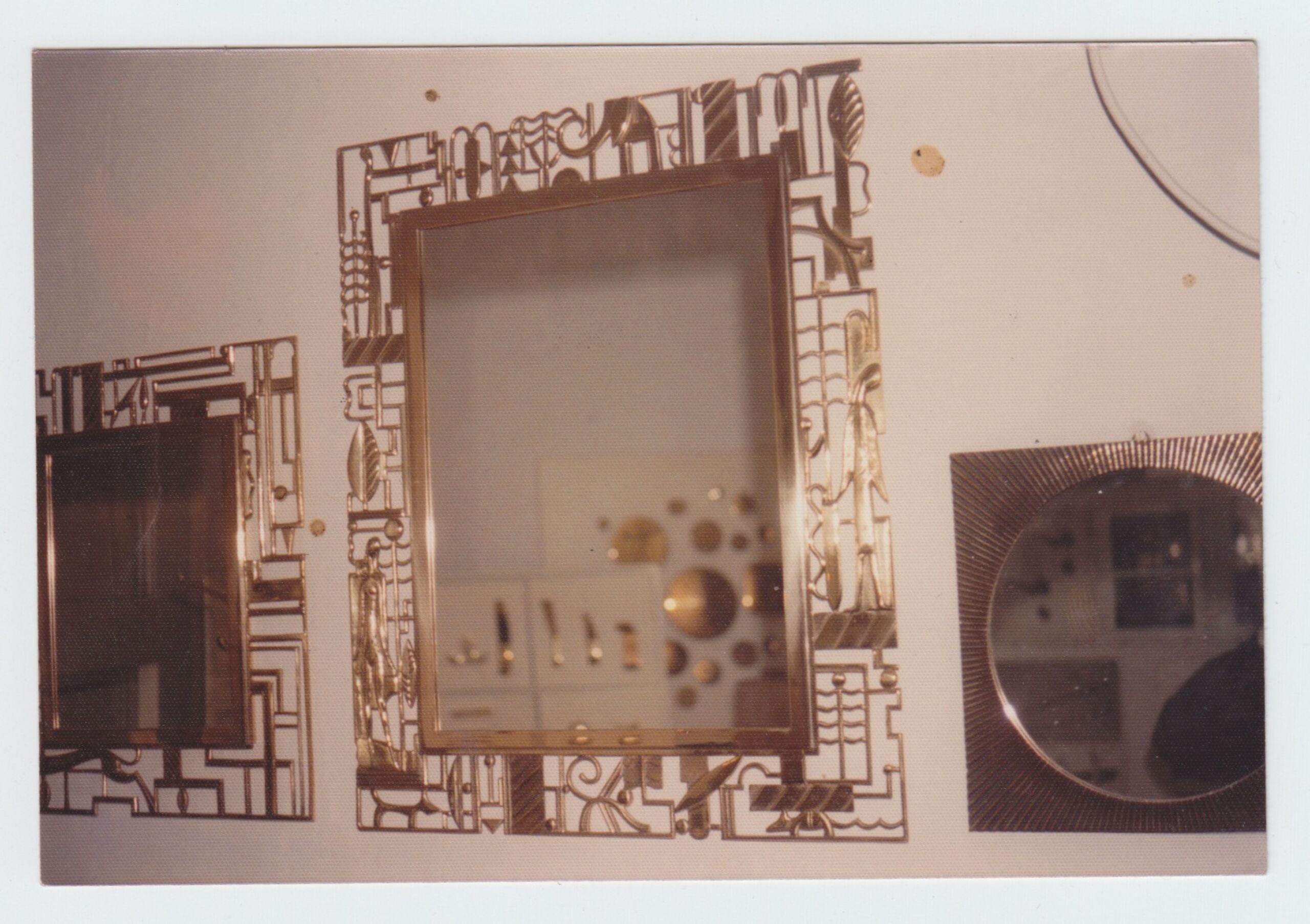 Fotografie, 3 Wandspiegel, links: mit ornamentalem Dekor, Hund und Reiher; Mitte: mit ornamentalem Dekor, 2 Frauen, Hunden, Katze und Elefant; rechts: mit Rillen, die Sonnenstrahlen um den runden Spiegel symbolisieren; Messingguss , Werkstätte Hagenauer, MAK Inv.nr. HAF 2078
