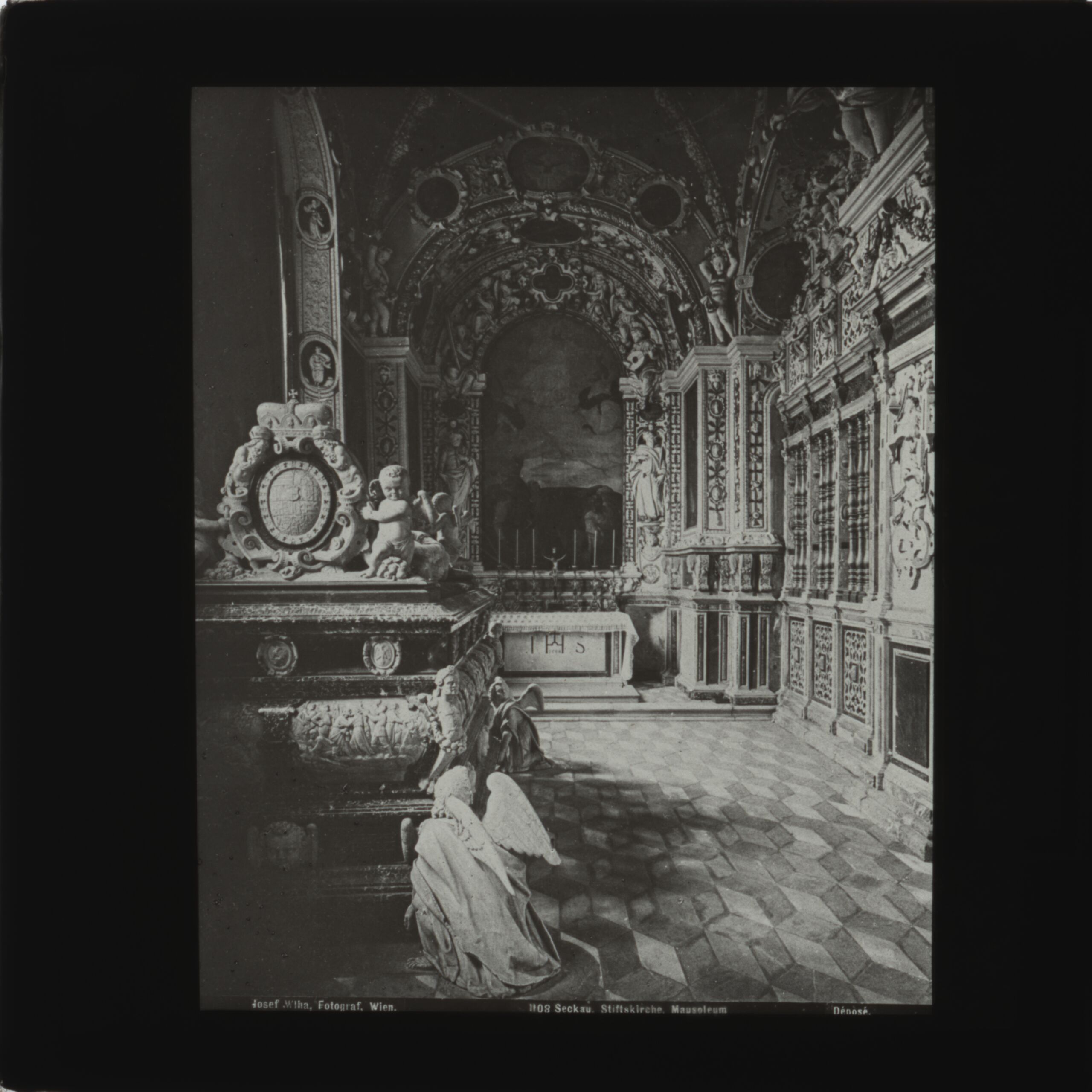 - Text am Objekt: Josef Wlha, Fotograf, Wien. 1108 Seckau. Stiftskirche. Mausoleum. Déposé.