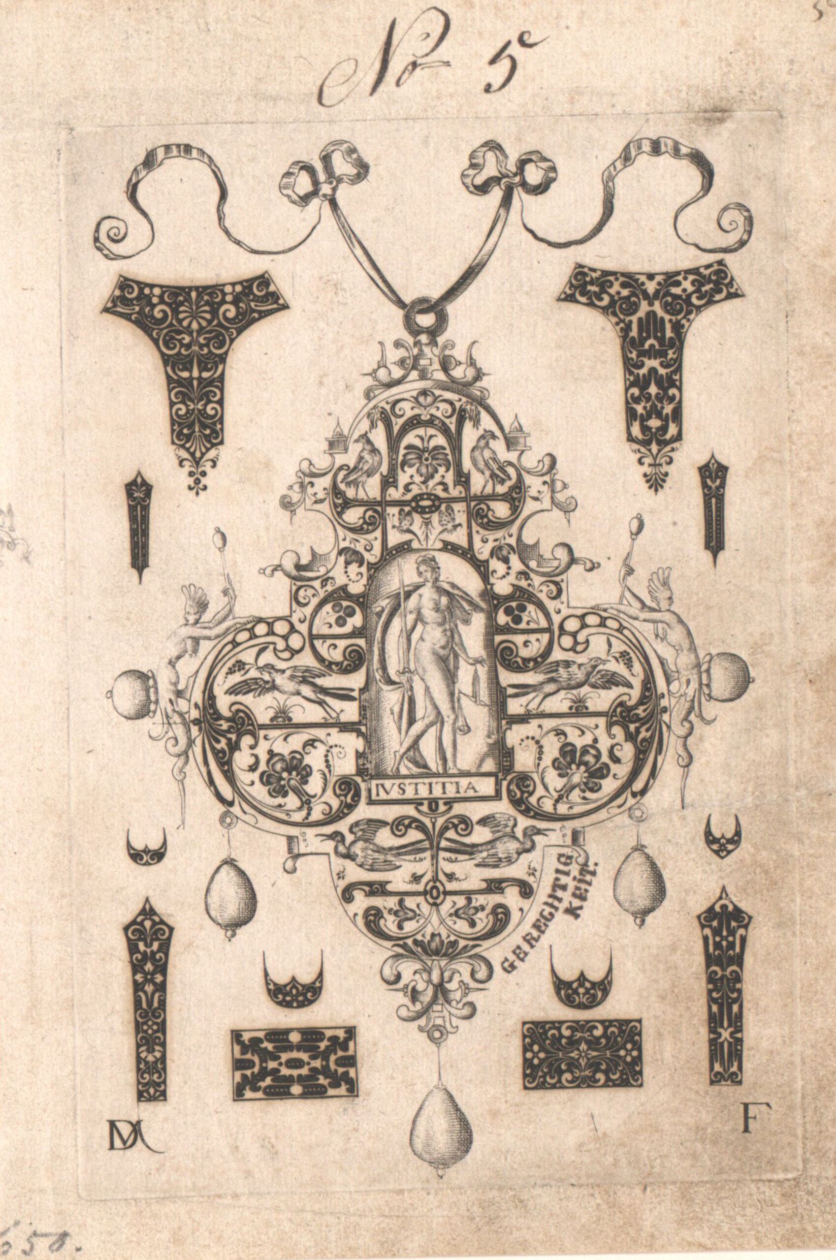 Ornamentstich, Anhänger mit der allegorischen Figur der Gerechtigkeit (Justitia) und Ringe, Blatt aus einer Folge von Goldschmiedearbeiten, auf dem Titelblatt die Aufschrift „In timore ac charitate dei Daniel Mignot fecit hoc Augustae Vindelicorum Anno 1593 (die restlichen Blätter in Fach 111/ 18), Daniel Mignot, MAK Inv.nr. KI 5650-7