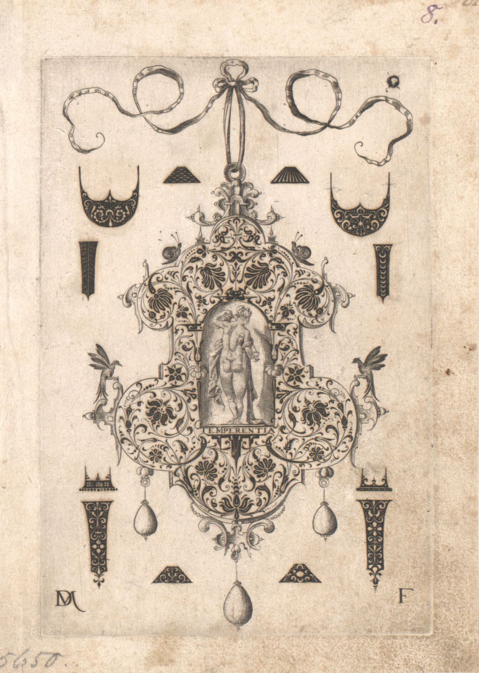 Ornamentstich, Anhänger mit der allegorischen Figur der Mäßigkeit (Temperantia) und Ringe, Blatt aus einer Folge von Goldschmiedearbeiten, auf dem Titelblatt die Aufschrift „In timore ac charitate dei Daniel Mignot fecit hoc Augustae Vindelicorum Anno 1593 (die restlichen Blätter in Fach 111/ 18), Daniel Mignot, MAK Inv.nr. KI 5650-6