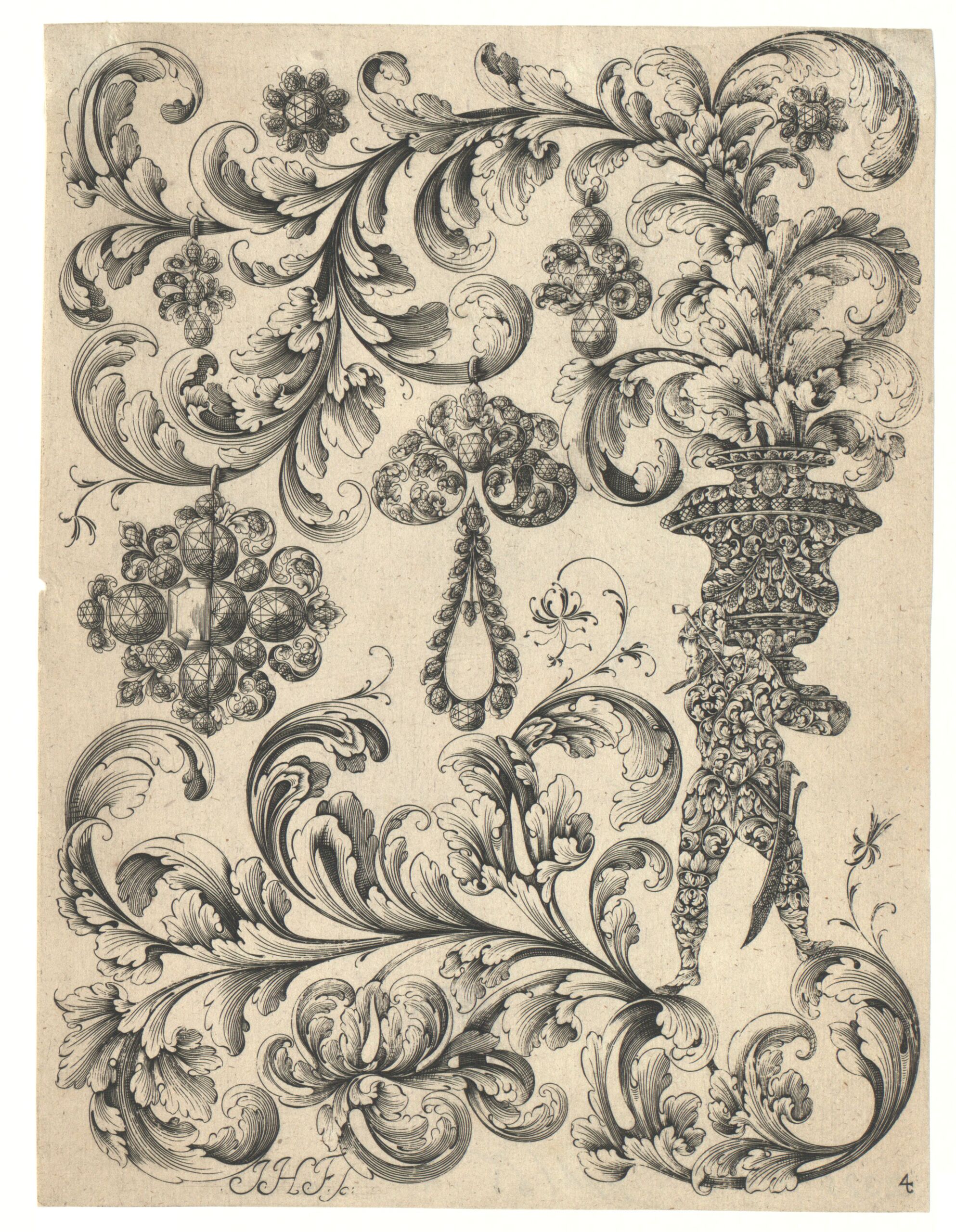 - Anhänger und andere Goldschmiedearbeiten, dazwischen Figuren aus Laubwerk, Blatt 4 aus der Folge „Vorstellung Allerhand Lauber, Bandel Carmosirter und anderer zum schneiden und graviren denen Gold und Silber Arbeitern dienlicher Erfindungen entworffen” (vom Bearbeiter vergebener Titel)