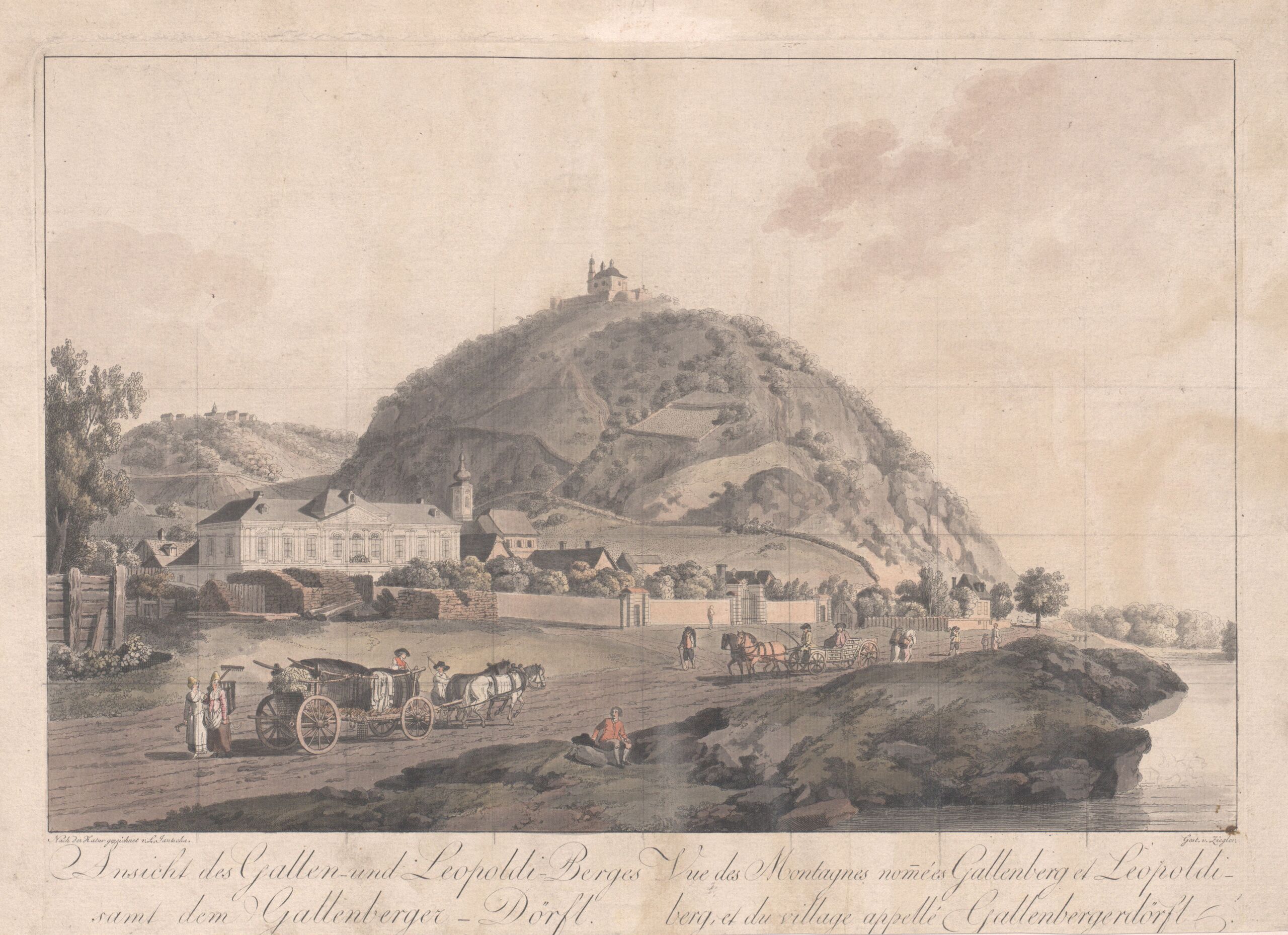 - Text am Objekt: Ansicht des Gallen- und Leopoldi- Berges/ samt dem Gallenberger- Dörfl. / Vue des Montagnes nomées Gallenberg et Leopoldi- / berg, et du village appellé Gallenbergerdörfl. / Nach der Natur gezeichnet v. L. Jantscha, Gest. v. Ziegler