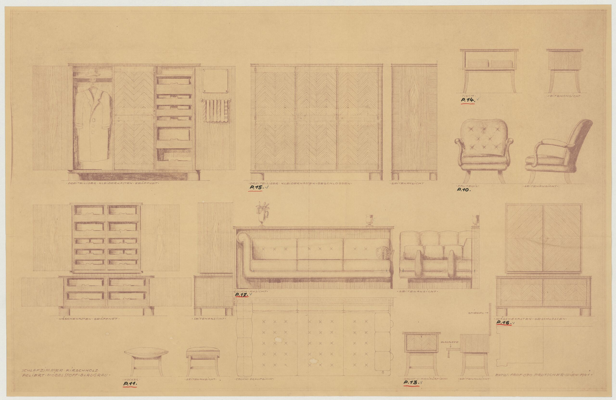 - Text am Objekt (Vorderseite) : DREITEILIGER KLEIDERKASTEN GEÖFFNET; DREITEILIGER KLEIDERKASTEN GESCHLOSSEN.; SEITENANSICHT ; TISCH; SEITENANSICHT; FAUTEUIL; SEITENANSICHT; WÄSCHEKASTEN GEÖFFNET; SEITENANSICHT; COUCH-ANSICHT; SEITENANSICHT; HOCKER; SEITENANSICHT; COUCH / DRAUFSICHT; NACHT- U. MANIKÜRTISCH; SPIEGEL / GLASPLATTE / SEITENANSICHT; WÄSCHEKASTEN GESCHLOSSEN