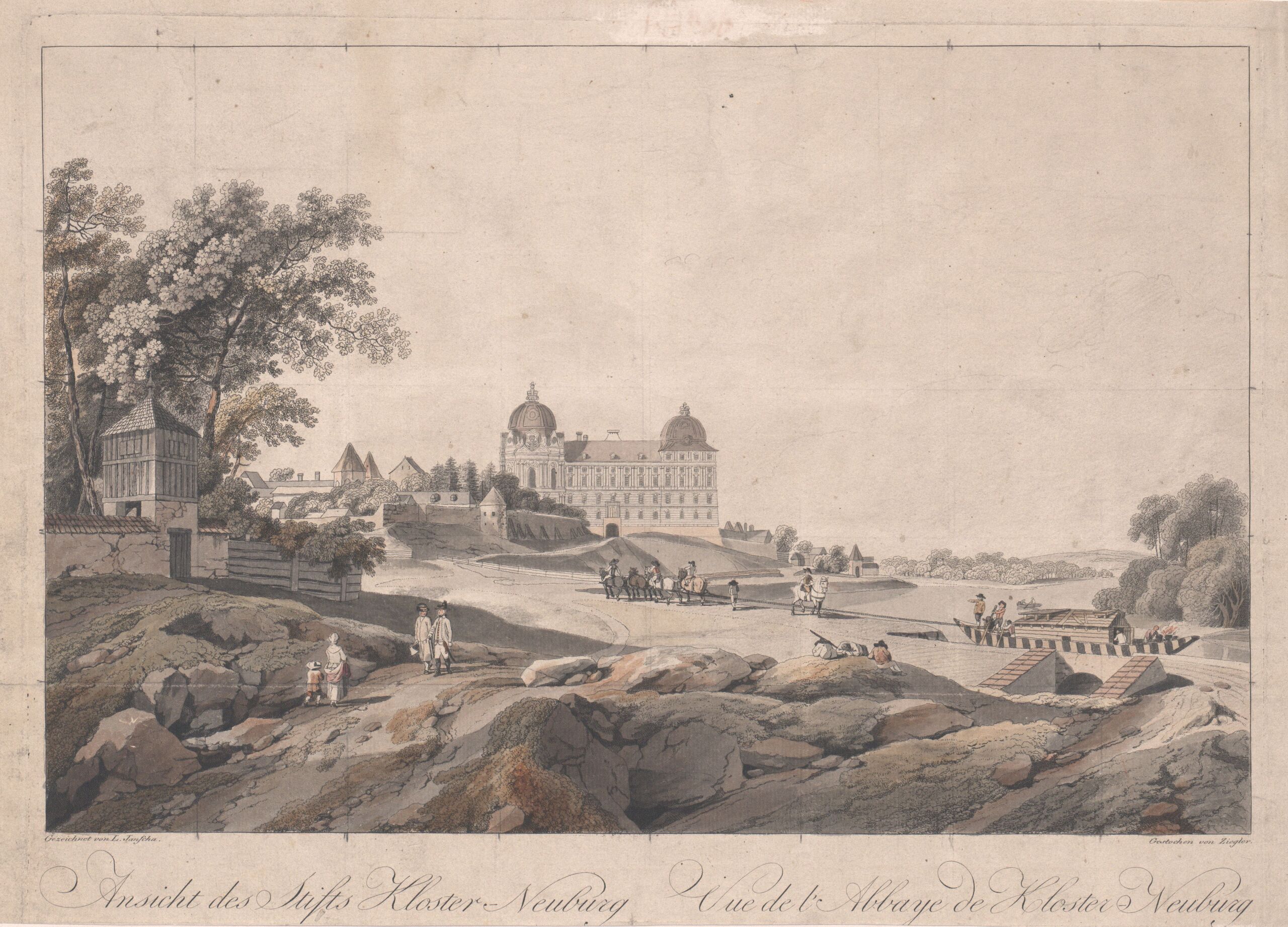 - Text am Objekt: Ansicht des Stifts Kloster- Neuburg / Vue de l‘ Abbaye de Kloster Neuburg / Gezeichnet von L. Janscha, Gestochen von Ziegler