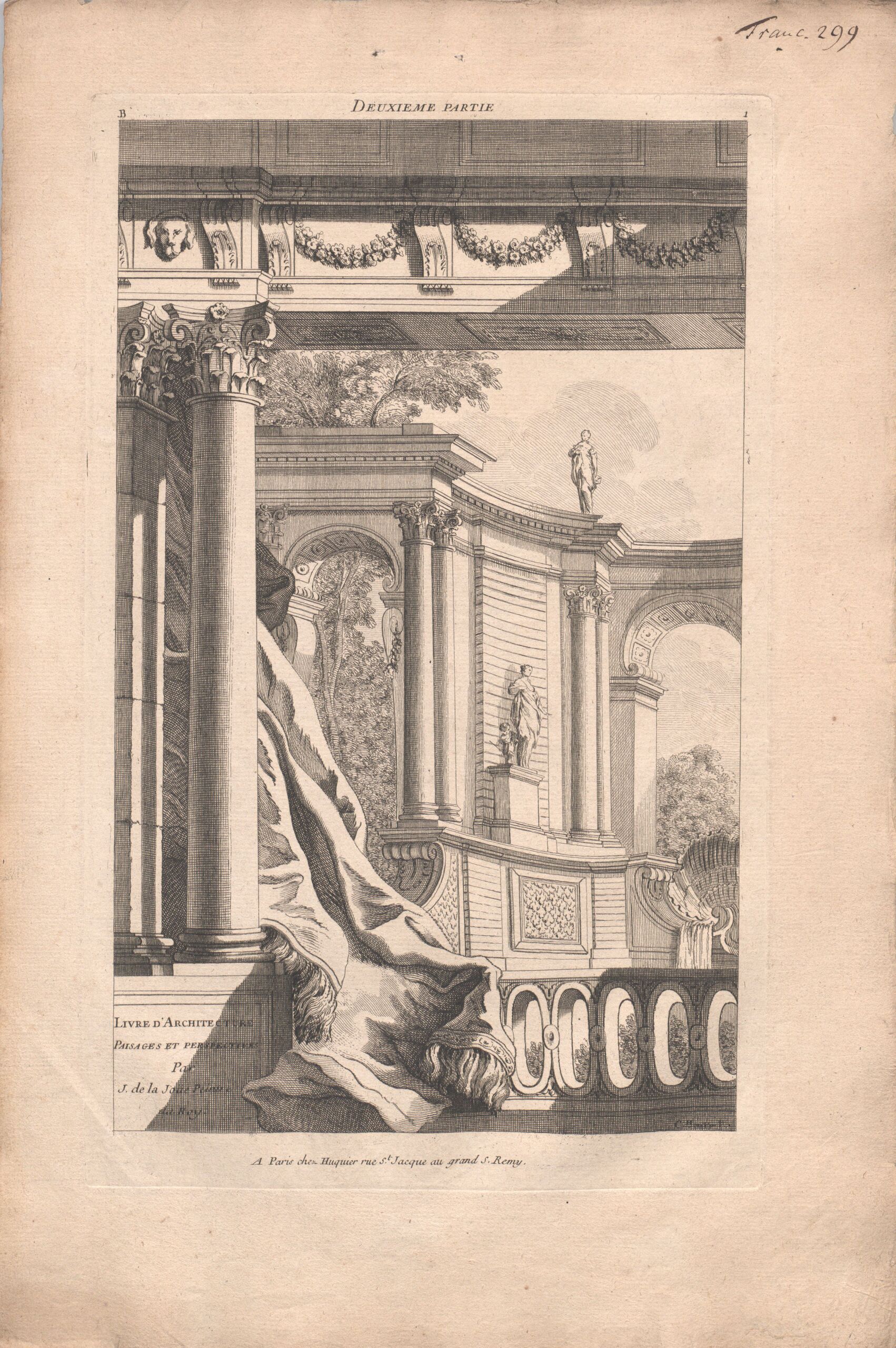 - Text am Objekt: DEUXIEME PARTIE. / LIVRE D‘ ARCHITECTURE/ PAISAGES ET PERSPECTIVES/ Par/ J. de la Joue Peintre/ du Roy / A Paris chez Huquier rue S.t Jacque au grand S. Remy. / B 1