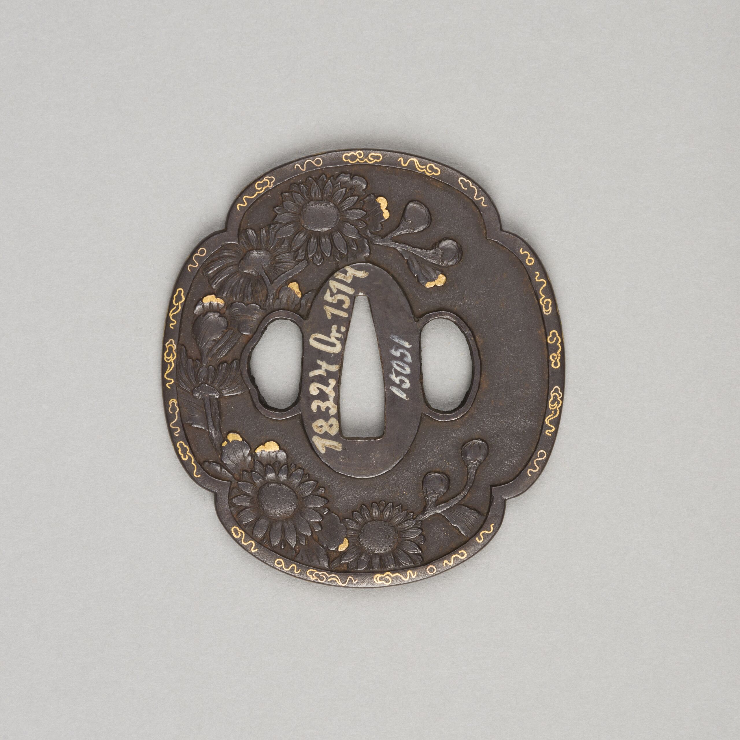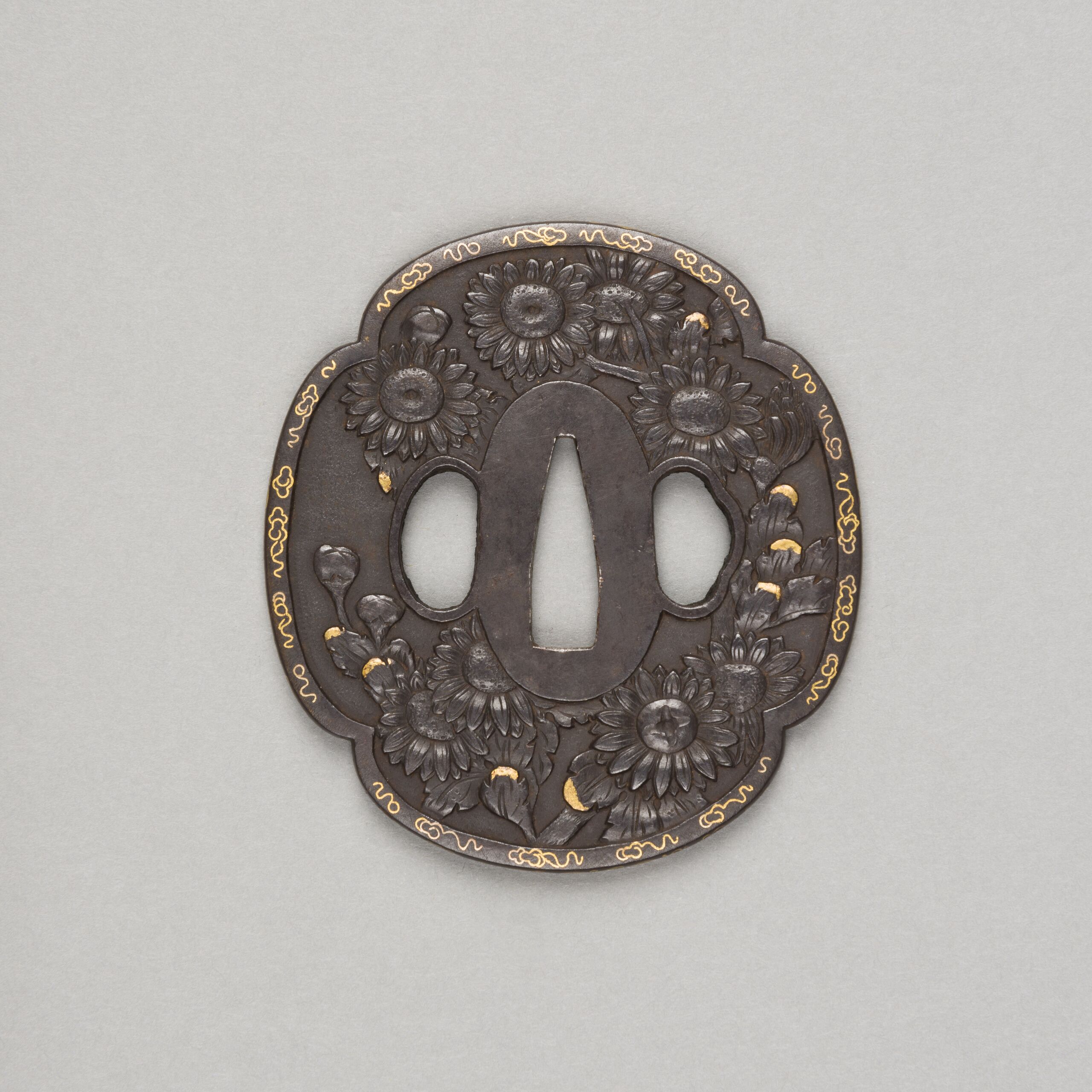 Form: Vierpass/Quittenblüten (mokkōgata 木瓜形); Relief mit teilweise linearen Goldeinlagen (zōgan 象嵌 = Tauschierung); Rankenmuster am Rand; zu beiden Seiten der länglichen Öffnung in der Mitte (nakagoana 中心穴 oder茎穴) befinden sich die Öffnungen kozukahitsu 小柄櫃 links und kōgaihitsu 笄櫃 rechts.