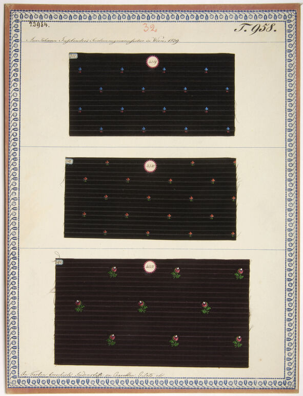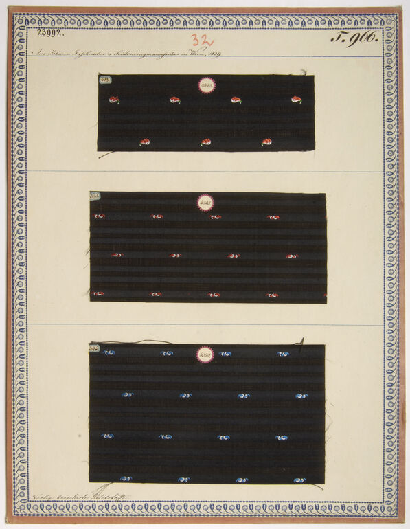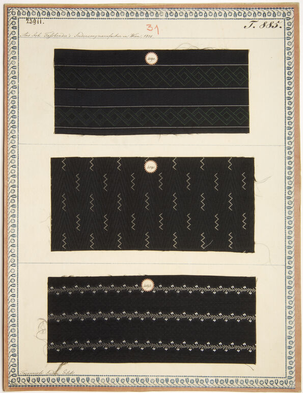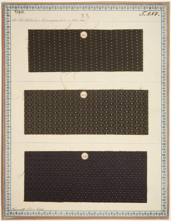 - Beschriftung (Vorderseite) : Von dem Seidenzeugfabrikanten Joh. Fassbender in Wien, 1837. / Atlas-Giletstoffe.
