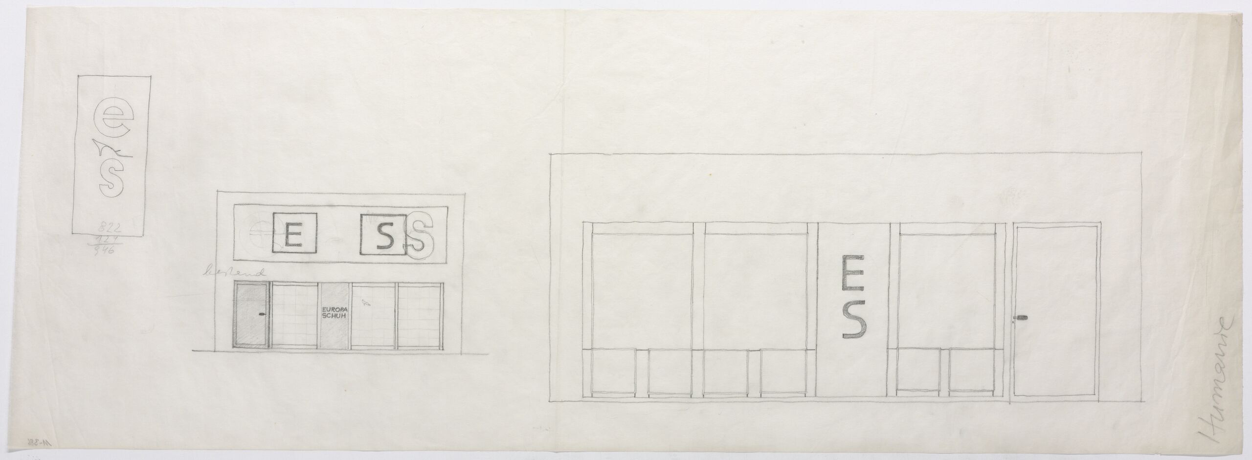 - Aufriss der Fassade mit Schaufenster und Logo, Aufriss der Wand zur Straße, Skizze des Logos (vom Bearbeiter vergebener Titel)