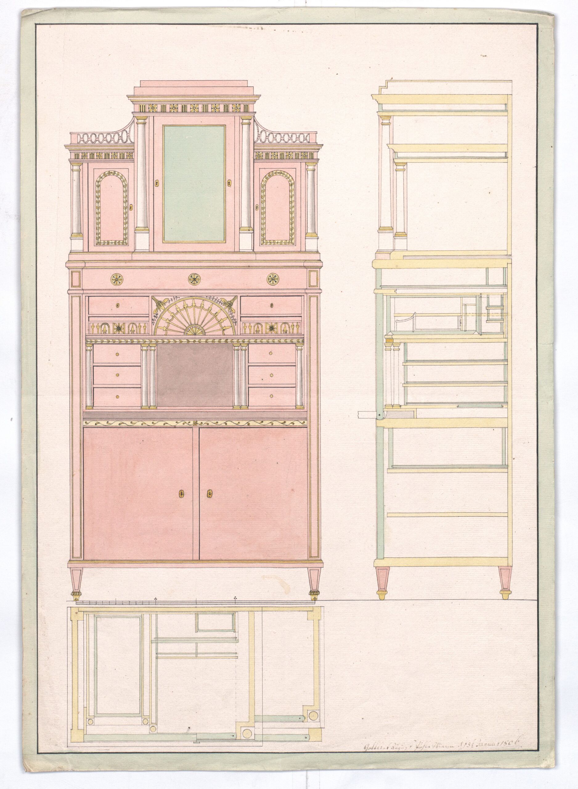 Grundriss, Aufriß, Grundriß und Querschnitt eines Sekretärs, Gottlieb August Pohle, MAK Inv.nr. KI 7813-22