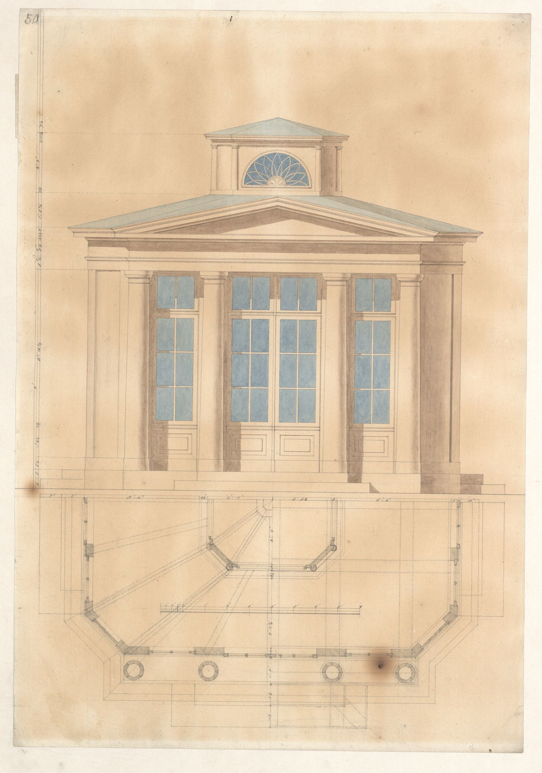 Aufriß und Grundriß eines polygonalen Pavillons auf niedrigem Unterbau mit jeweils vier dorischen Säulen vor zwei der Fensterfronten, einem schlichten Dreiecksgiebel darüber sowie einem Innenraum, der sich am Dach durch eine Laterne widerspiegelt.