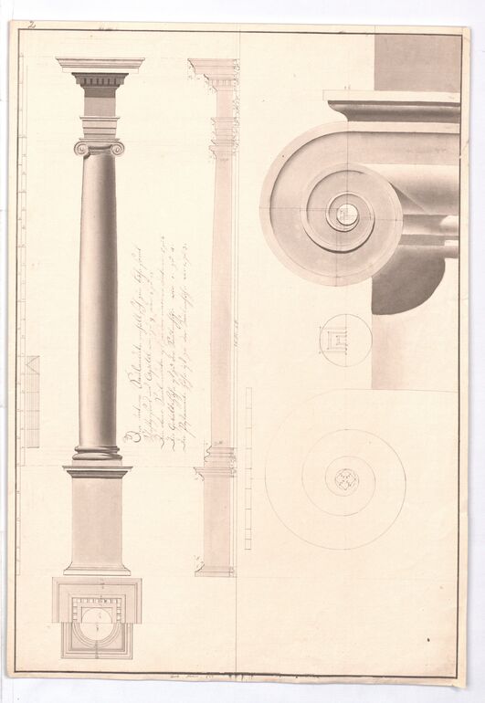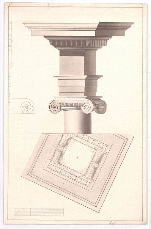 Aufriss, Aufriß und Untersicht eines Kapitells samt Gebälk der Korinthischen Säulenordnung, Franz Marini, MAK Inv.nr. KI 7710-304