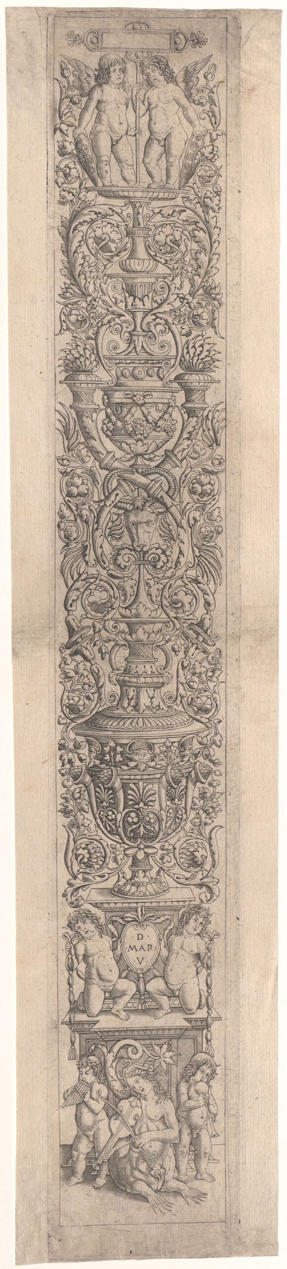 Ornamentstich, Aufsteigendes Ornament. Unten eine musizierende Sirene, oben zwei Putti und eine leere Schrifttafel, Miller schreibt die Stiche Giovanni Pietro da Birago und Giovanni Antonio da Brescia zu, traditionellerweise wurde das Monogramm ZA mit “Zoan Andrea inv.” identifiziert, Giovan Pietro Birago, MAK Inv.nr. KI 2672