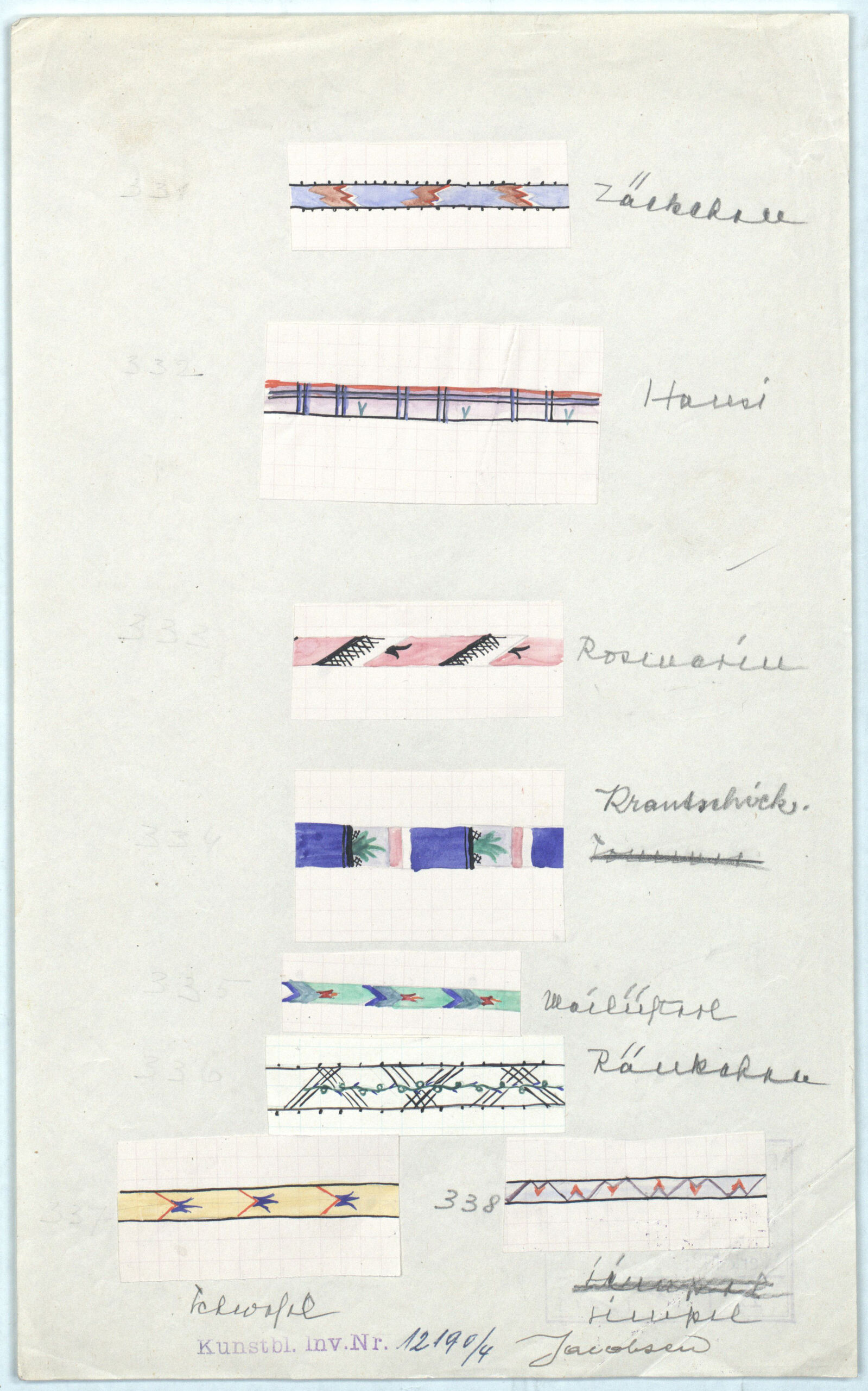 Entwurf, Bänder: "Zäckchen", "Hansi", "Rosmarin", "Krautschick", "Mailüfterl", "Ränkchen", "Schwefel", "Henkel", Wiener Werkstätte, MAK Inv.nr. KI 12190-4