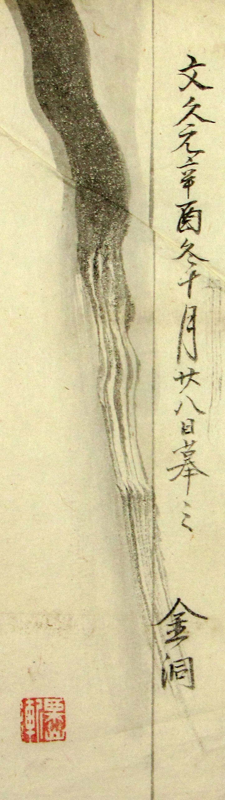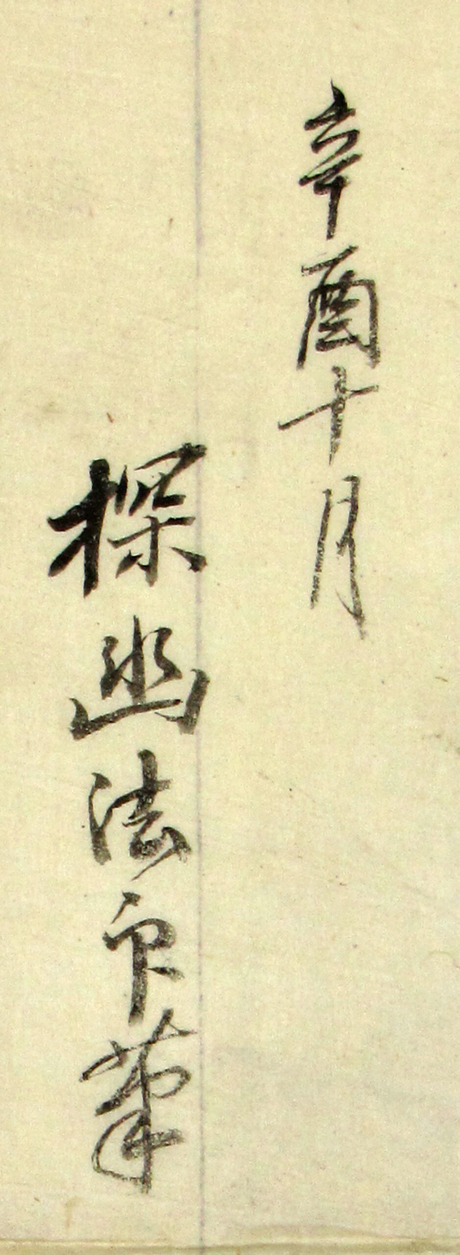 - Text im Bild: dies wurde in Bunkyū im Winter des Jahres des jüngeren Metalls und des Hahnes am 28. Oktober ?, Kindō Rückseite: Jahr des jüngeren Metalls und des Hahnes, gemalt nach dem Hōin Tan'yū
