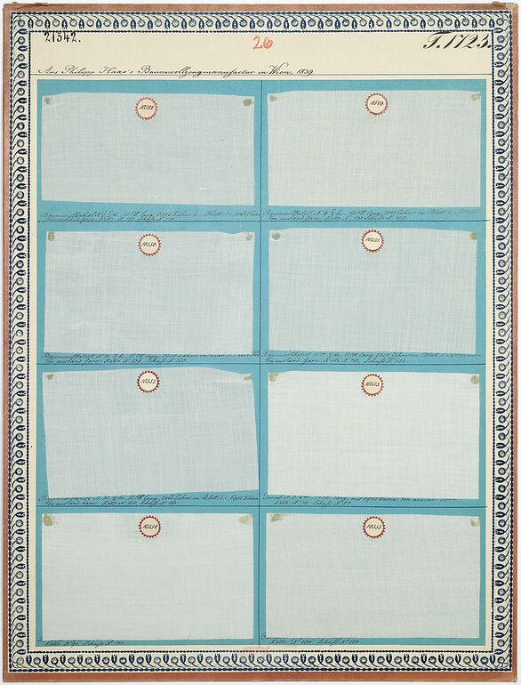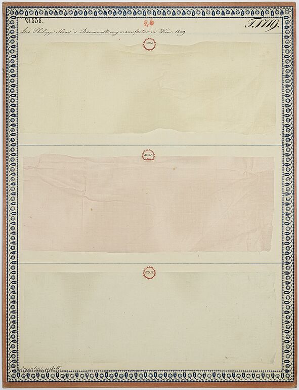 - Beschriftung (Vorderseite) : Aus Philipp Haas's Baumwollwarenmanufacture in Wien, 1839. / Baumwoll-Möbel-Damast, 13/8 breit. Die Kette ist Baumwollzwirn N. 60, der Eintrag N. 22.