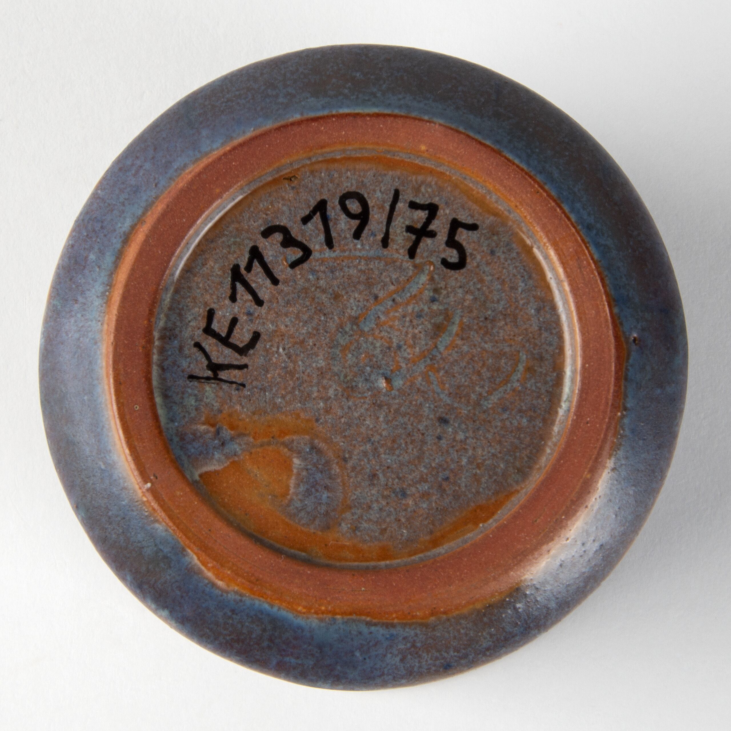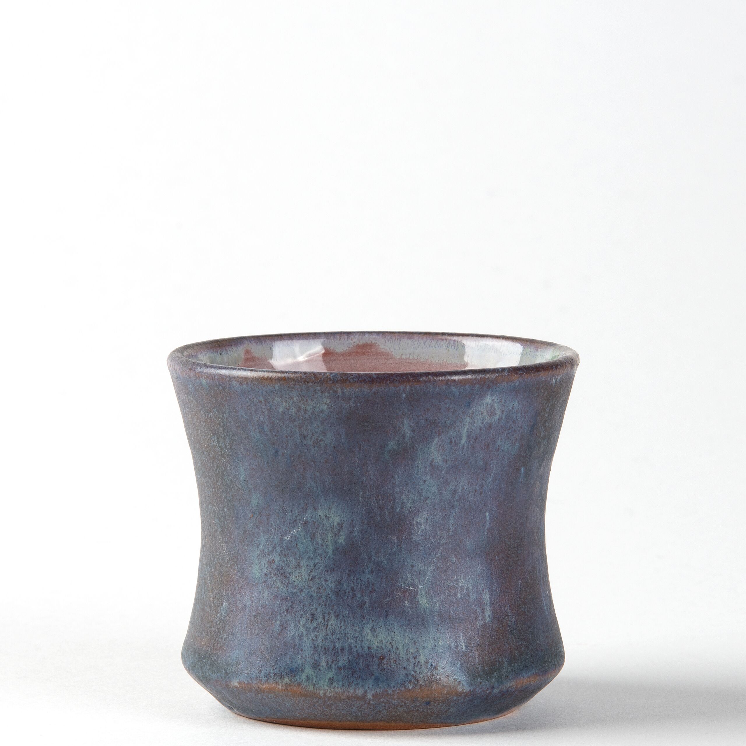 Becher, ohne Henkel, Ton, roter Scherben, getöpfert, außen semimatte blaulila Glasur, mit grüntürkisen Stellen, innen weißlich glänzend glasiert