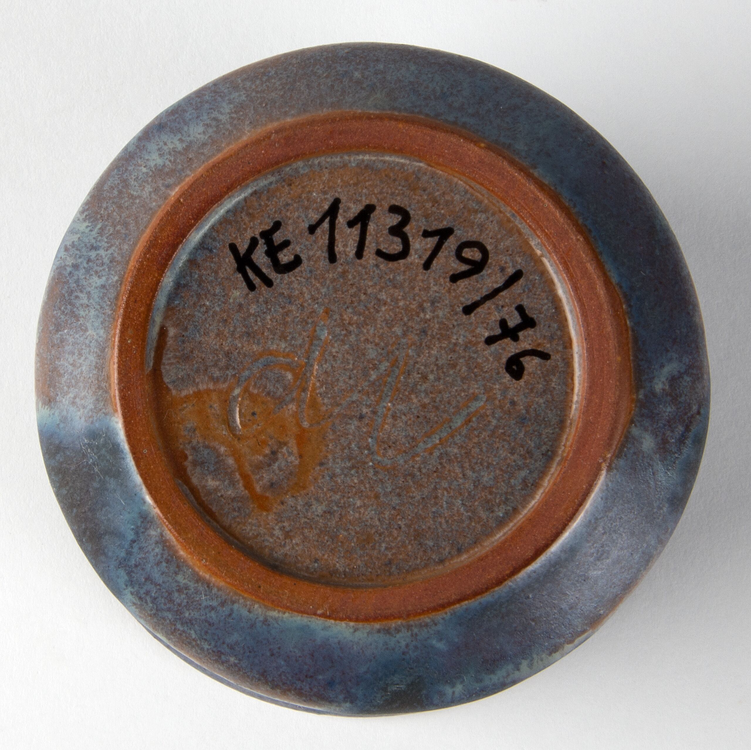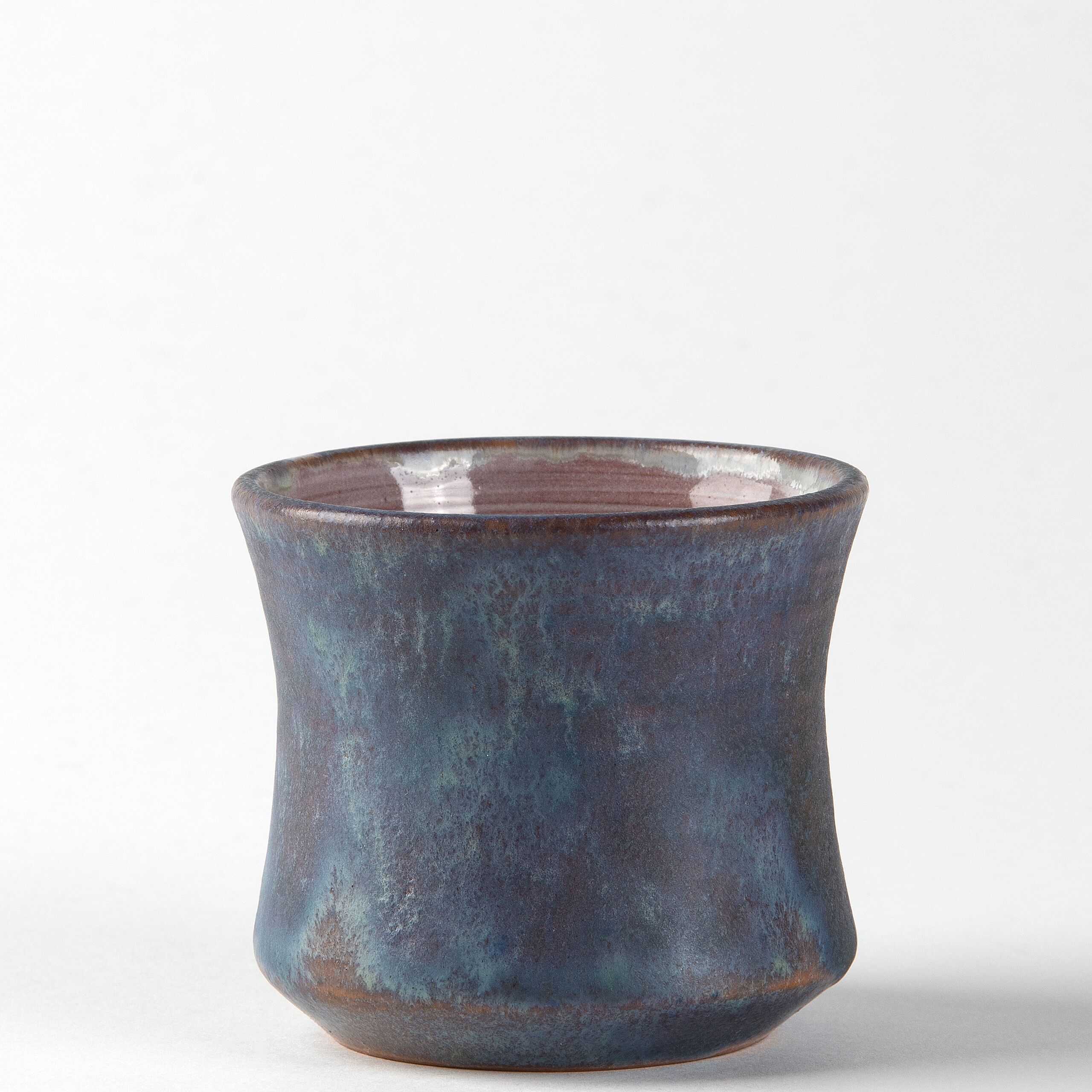 Becher, ohne Henkel, Ton, roter Scherben, getöpfert, außen semimatte blaulila Glasur, mit grüntürkisen Stellen, innen weißlich glänzend glasiert