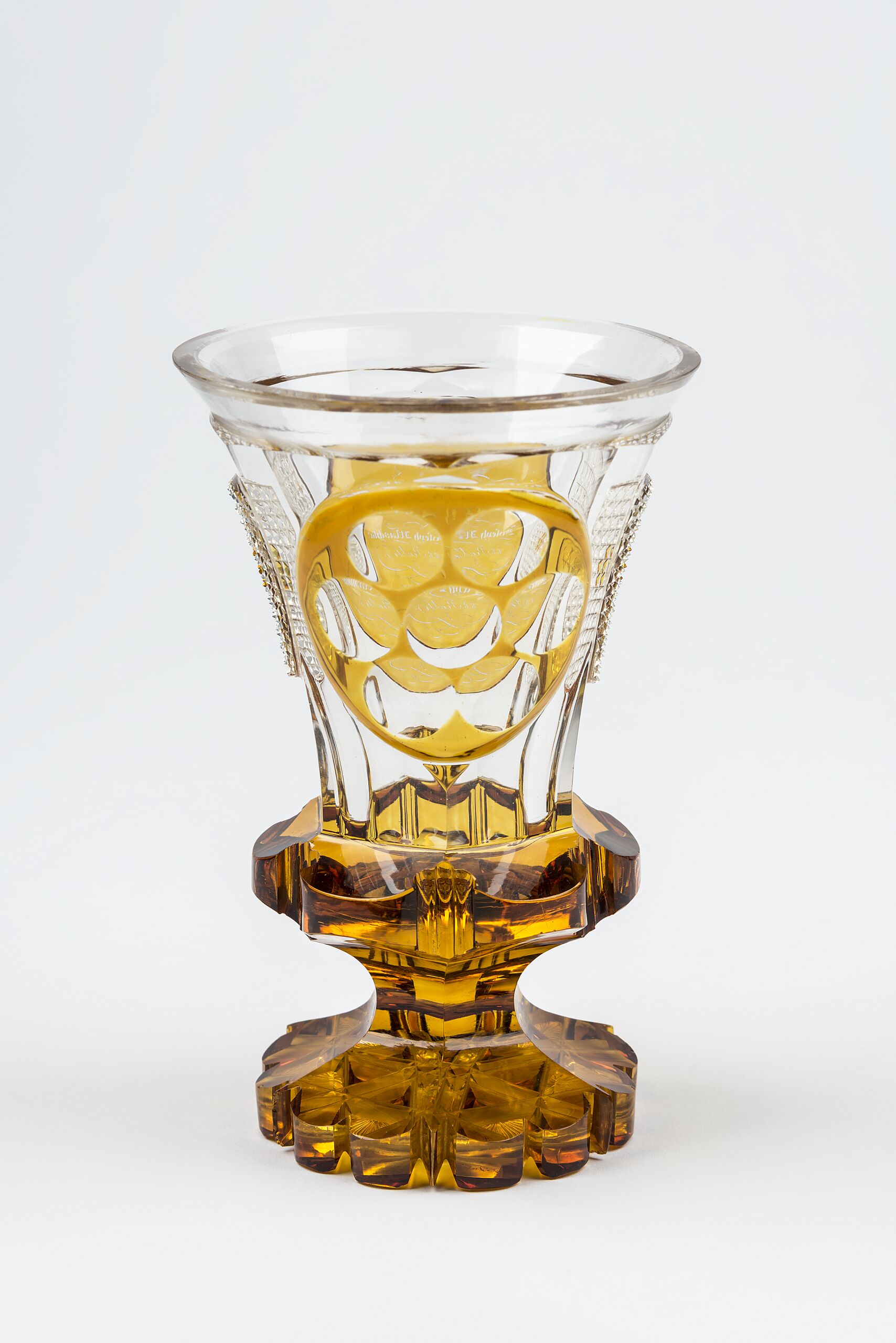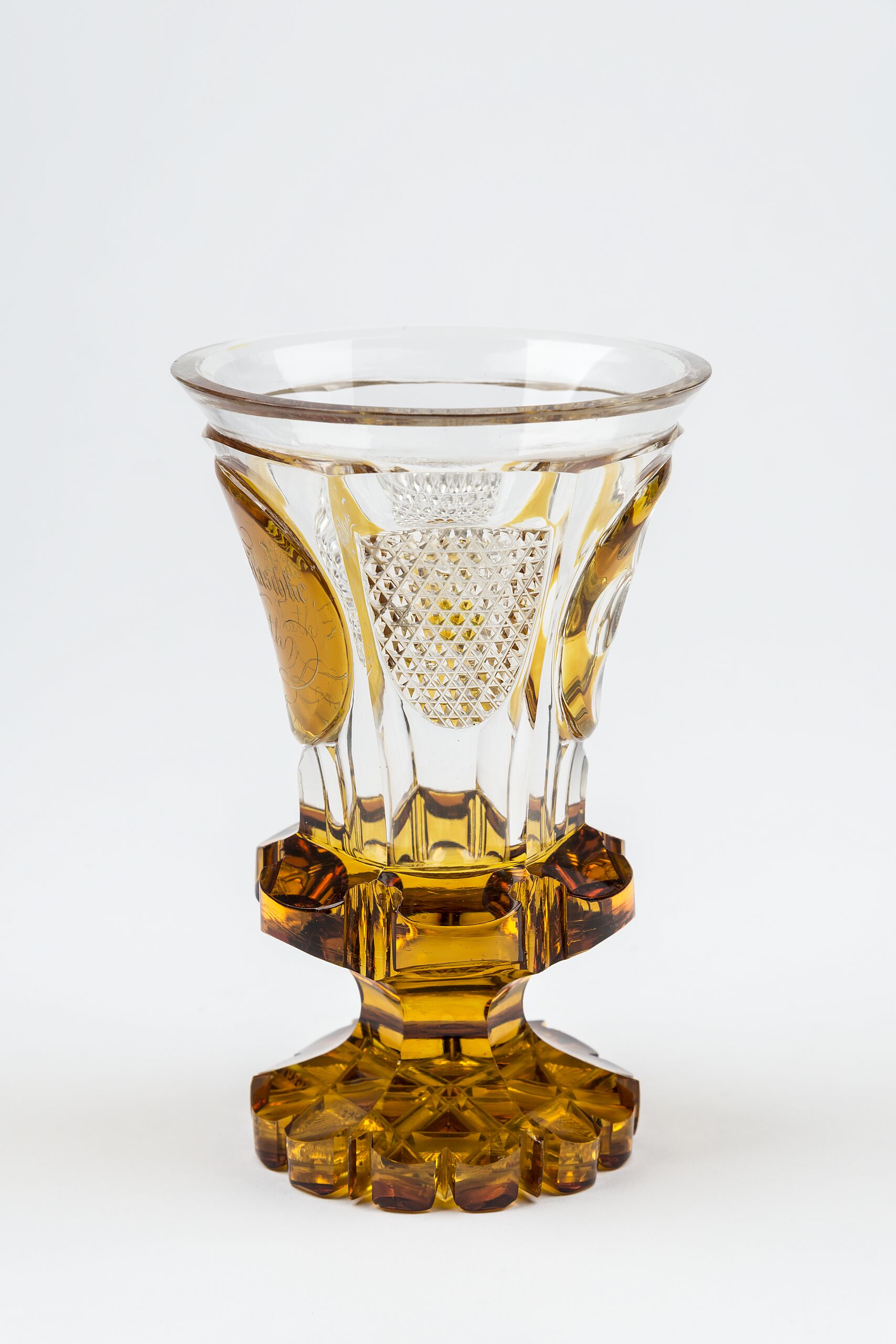 mit Gelbätzung und Schnitt. Reliefmedaillon mit: "Josef Maschke K.K. Rath", zwei Schildfelder mit Steindelung. Verkleinerungslinsen. Sechsseitiger Wulst. Fuss strahlig zerlegt