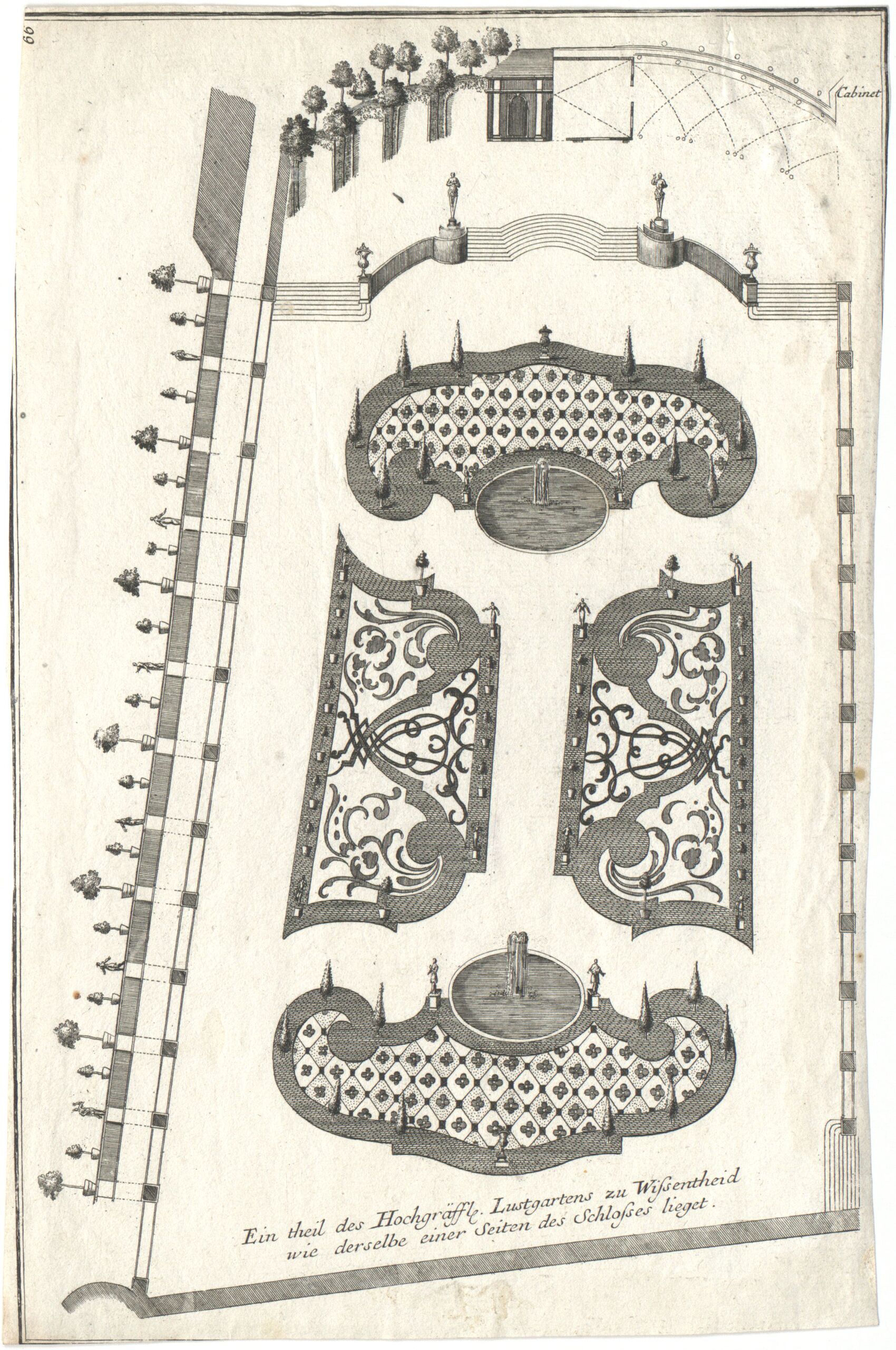 - Text am Objekt: Cabinet. Ein theildes Hochgräffl. Lustgartens zu Wissentheid/ wie derselbe einer Seiten des Schlosses lieget. / 66