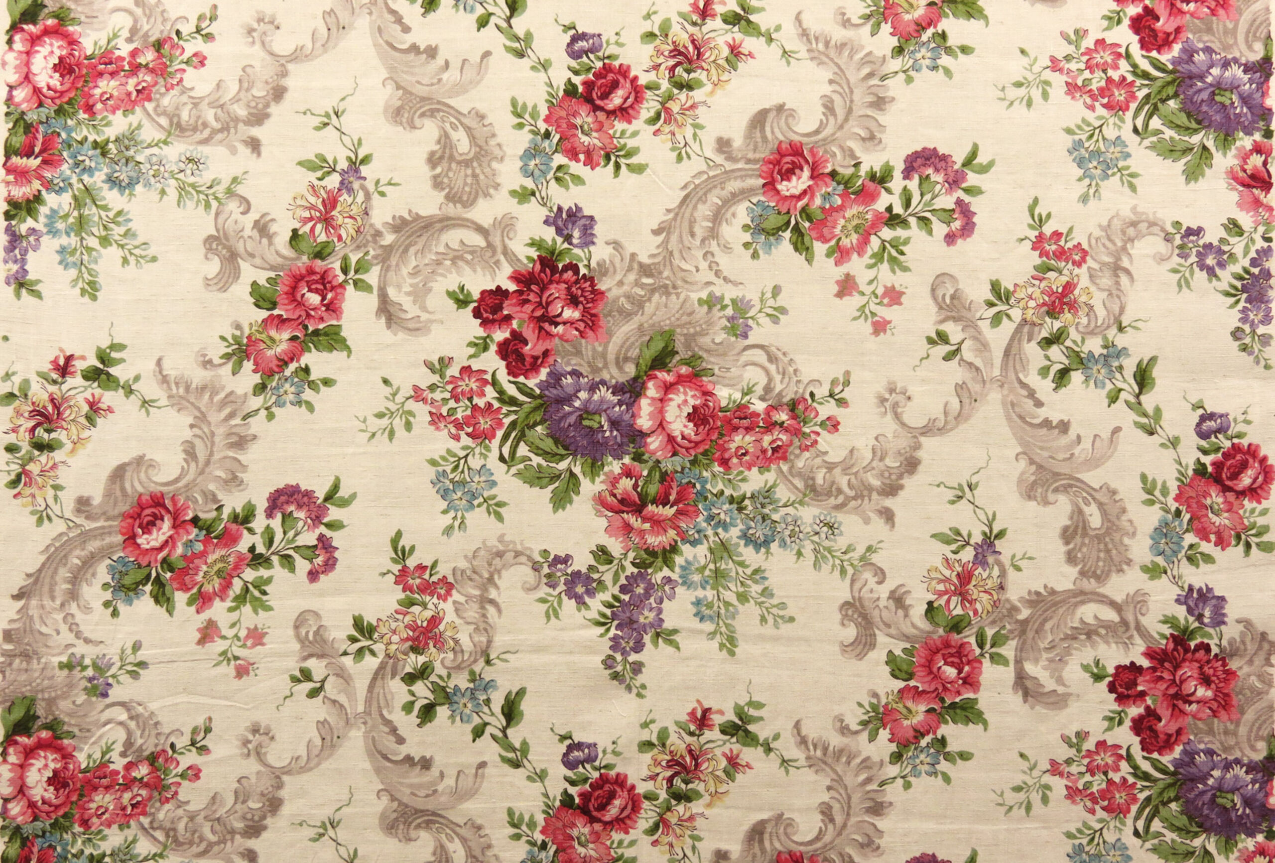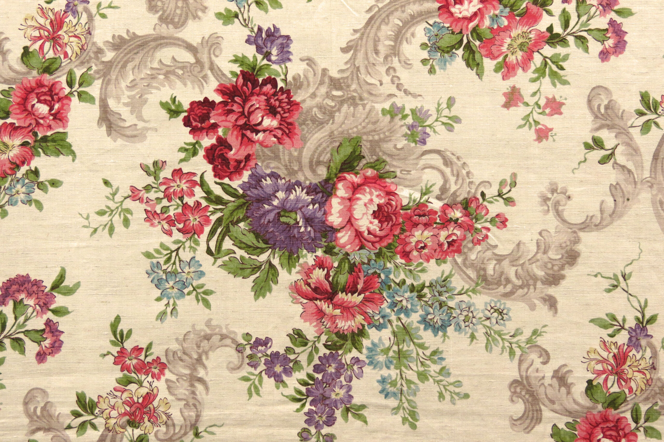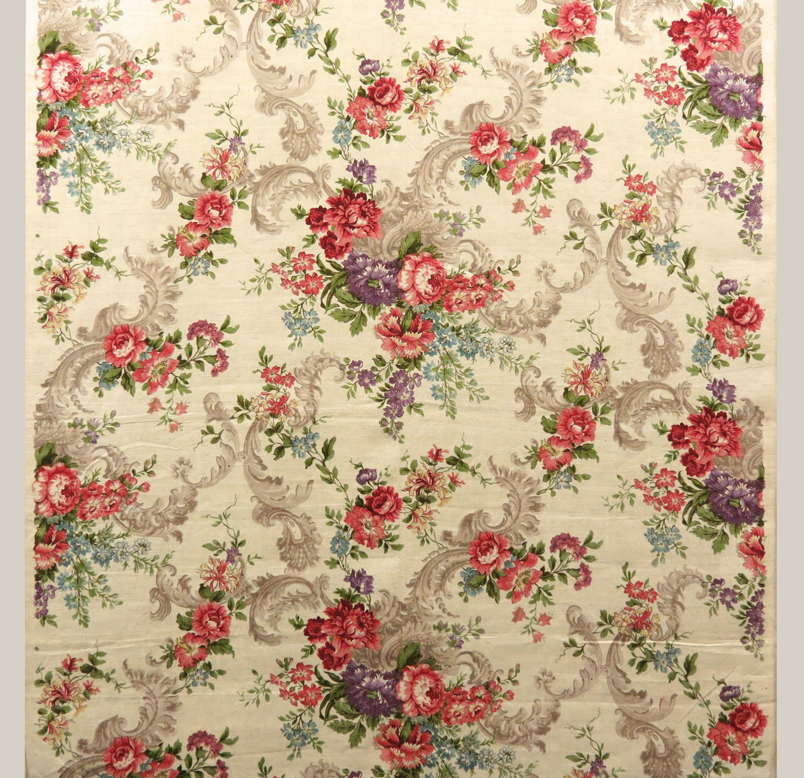 Dekorstoff, Beige Rokokoschnörkel mit Blumensträußen und Blütenranken, auf naturweißem Grund, Anonym, MAK Inv.nr. T 6665