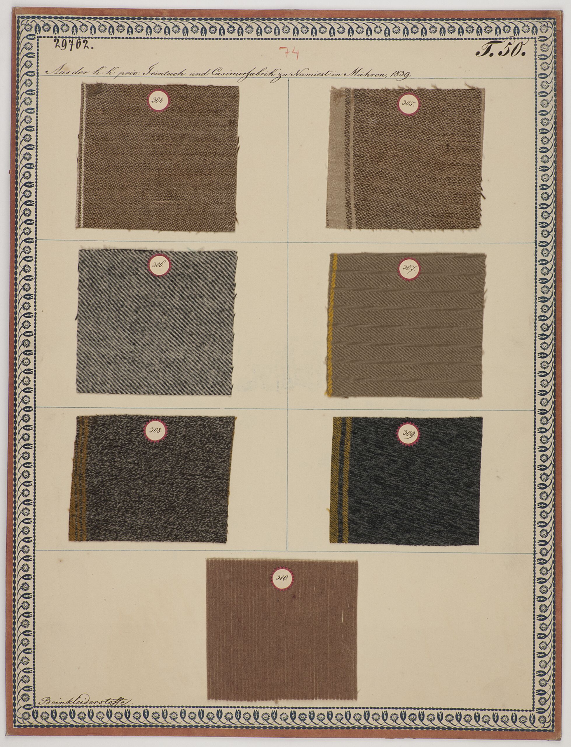 - Beschriftung (Vorderseite) : Aus der K: K: priv: Feintuch- und Casimirfabrik zu Namiest in Mähren, 1839. / Beinkleiderstoffe.