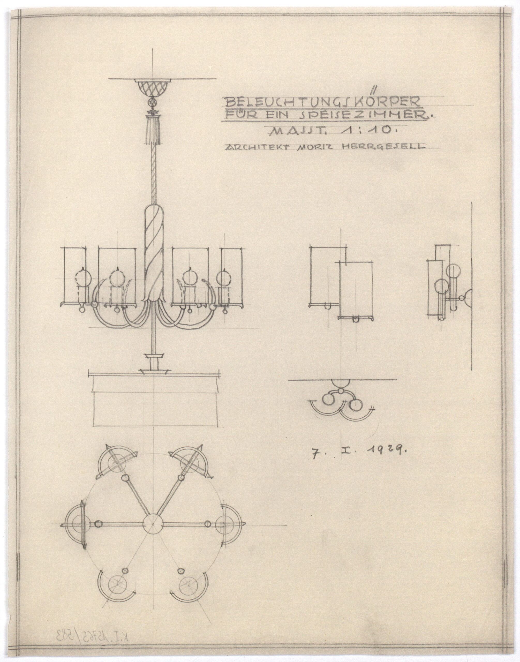 • Text am Objekt: BELEUCHTUNGSKÖRPER / FÜR EIN SPEISEZIMMER / ARCHITEKT MORIZ HERRGESELL / 7. I. 1929 /