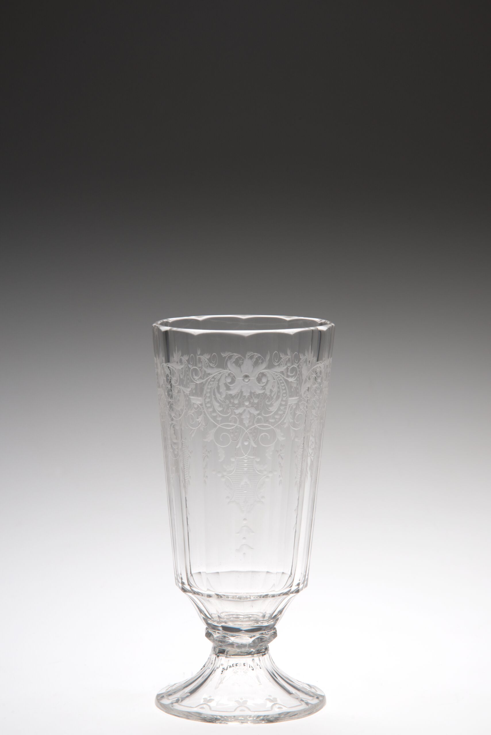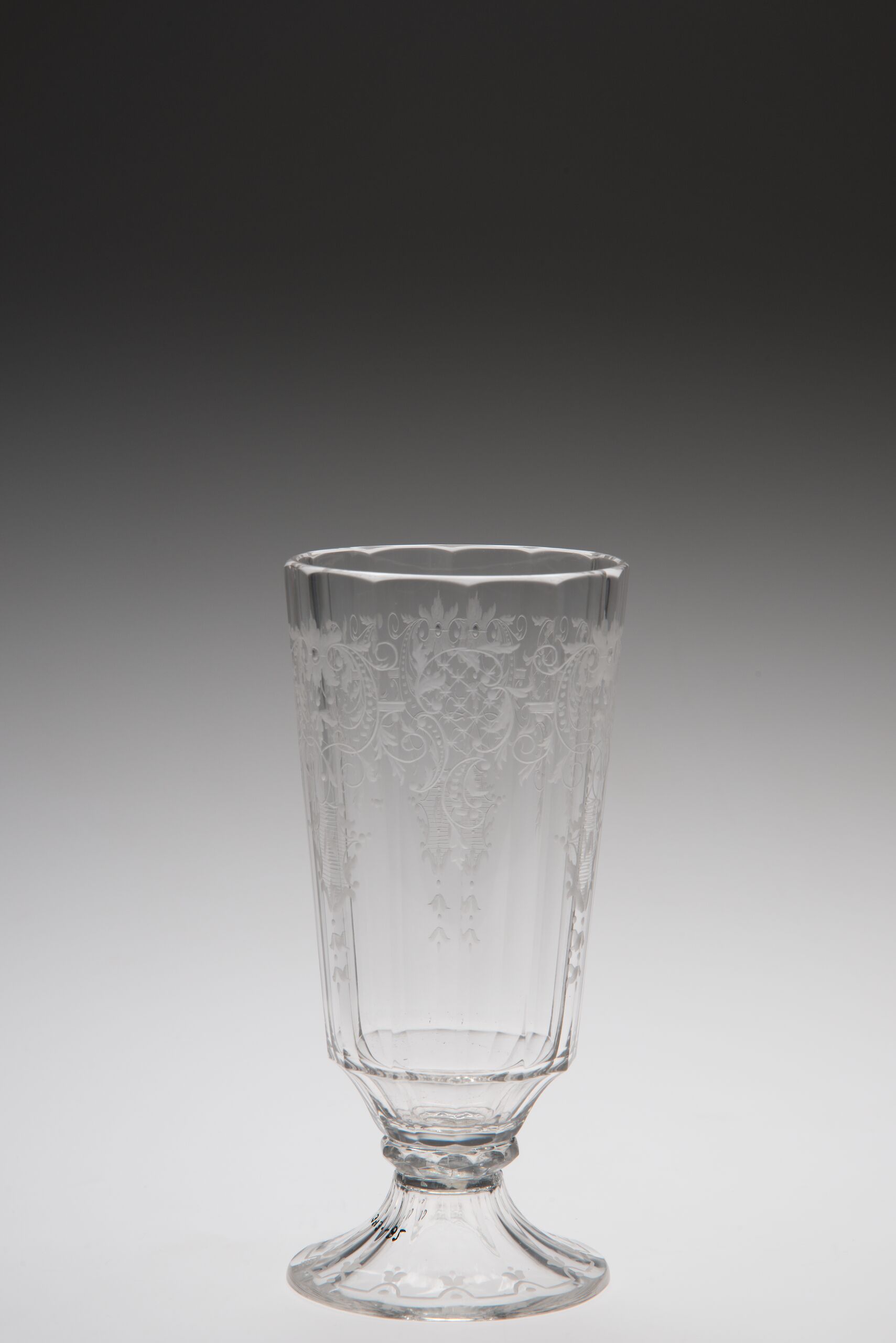 reich ornamentiert, geschliffen und graviert, hohe Becherform auf niedrigem Fuss