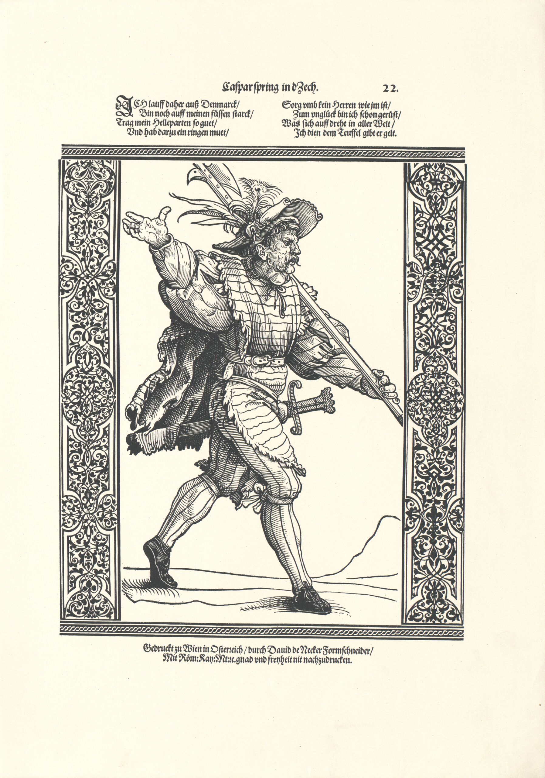 - Blatt 22 aus einer Folge von Reproduktionen nach Holzschnitten von Jost de Negker, ursprünglich herausgegeben in Wien (Edelleute/Krieger) (vom Bearbeiter vergebener Titel)