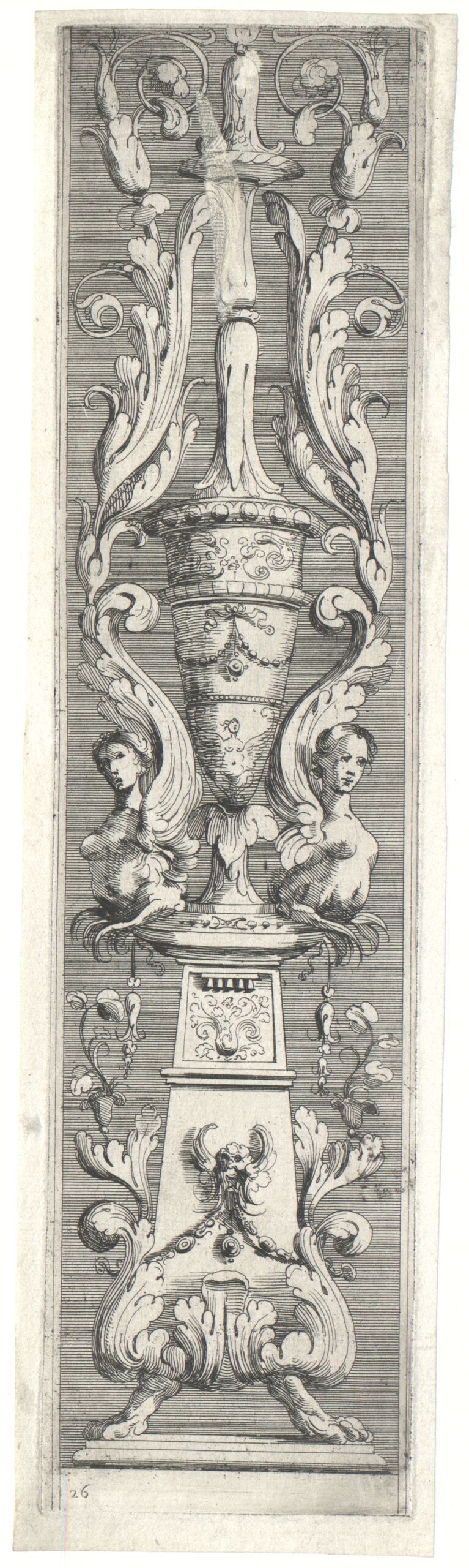 - Blatt 26 aus einer Folge von Pilasterornamenten, von denen je zwei einen kompletten Pilaster bilden, evt. aus der Folge „Freggi dell‘ Architettura da Agostino Mitelli etc.“ (vom Bearbeiter vergebener Titel)