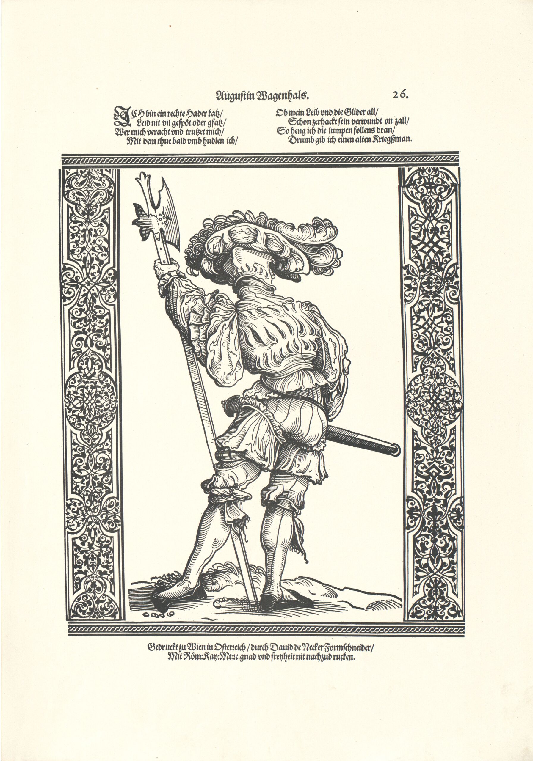 - Blatt 26 aus einer Folge von Reproduktionen nach Holzschnitten von Jost de Negker, ursprünglich herausgegeben in Wien (Edelleute/Krieger) (vom Bearbeiter vergebener Titel)