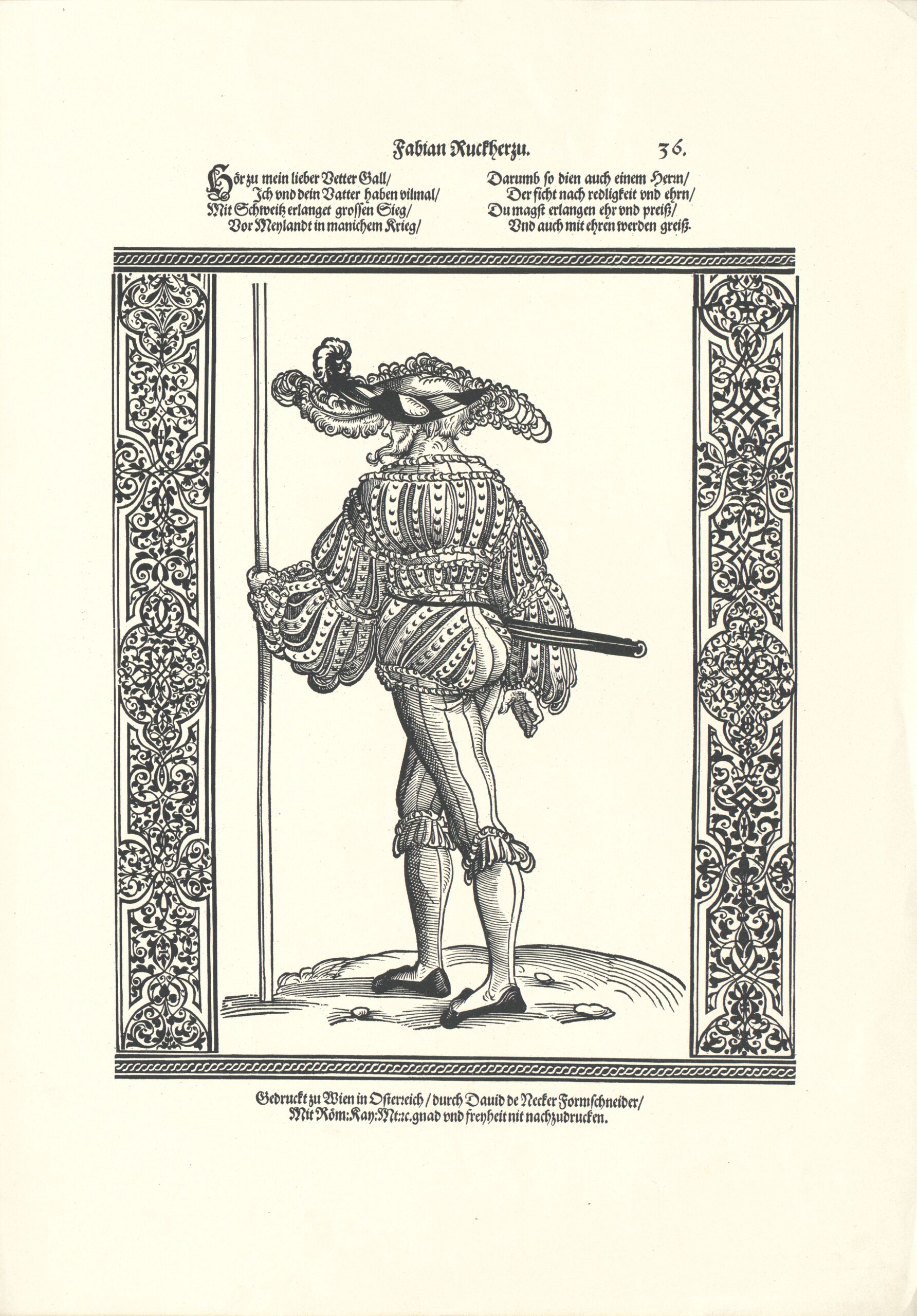 - Blatt 36 aus einer Folge von Reproduktionen nach Holzschnitten von Jost de Negker, ursprünglich herausgegeben in Wien (Edelleute/Krieger) (vom Bearbeiter vergebener Titel)
