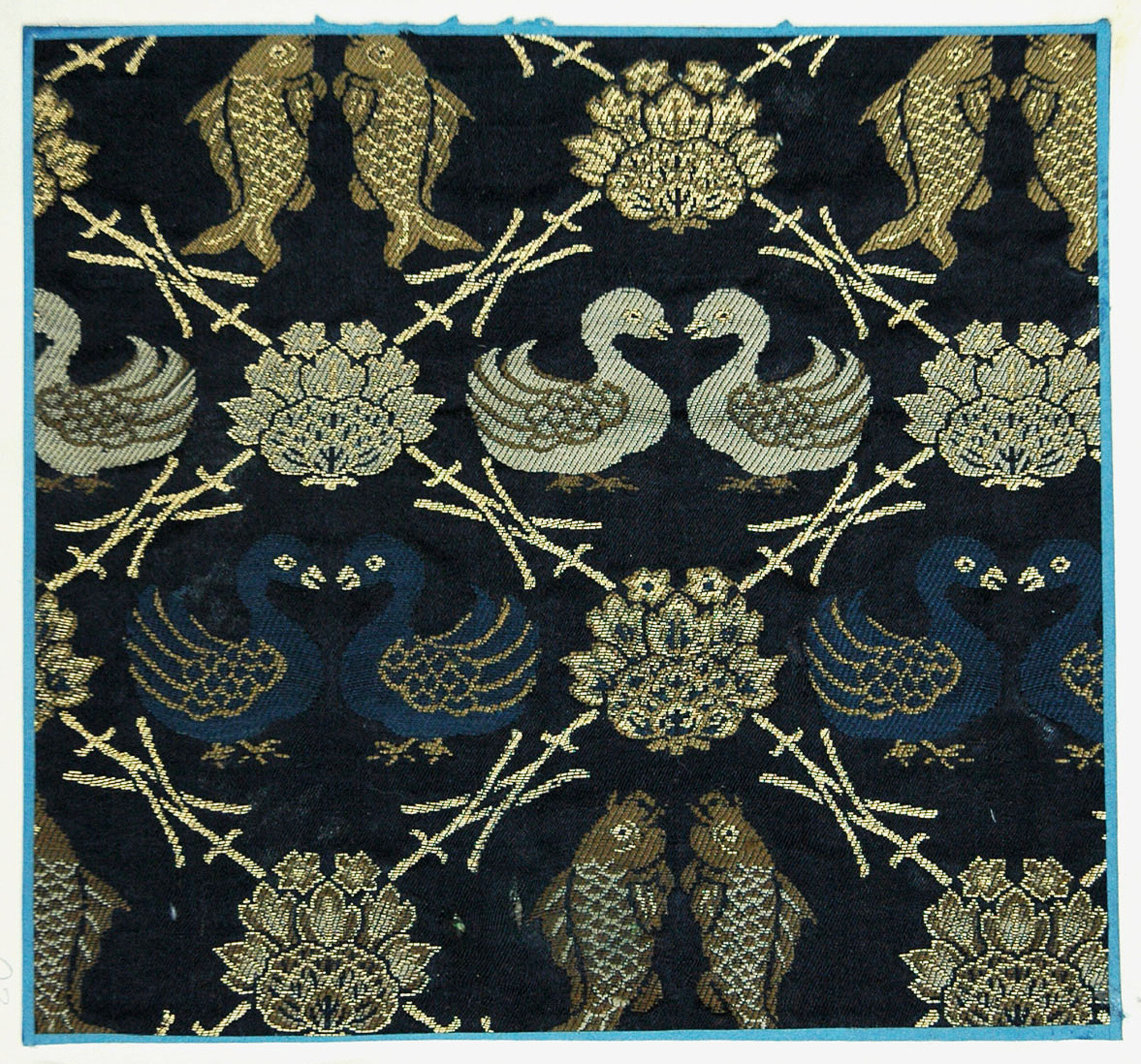 - Blüten, Enten- und Fischpaare auf dunkelblauem Grund (deskriptiver Titel)