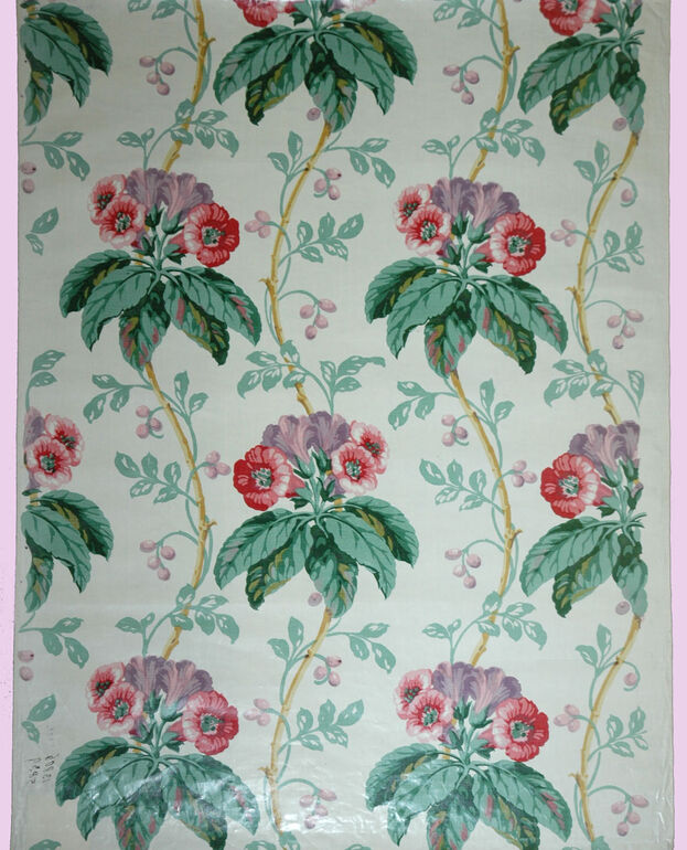 Dekorstoff, Blumenranken, blaue Bänder, Girlanden und großer Blumenkorb, Green & Abbott, MAK Inv.nr. T 5827