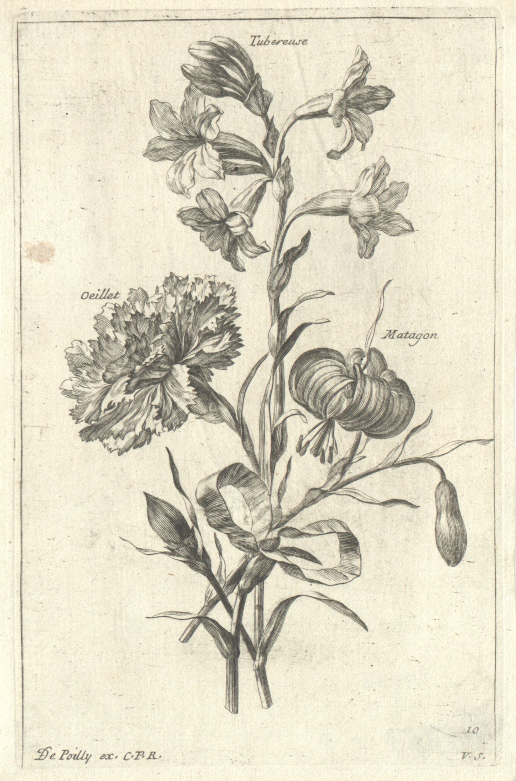 - Blumenstrauß, Blatt 10 aus einer Folge von Blumensträußen mit den jeweiligen Bezeichnungen der Blumen, herausgegeben von Poilly (vom Bearbeiter vergebener Titel)