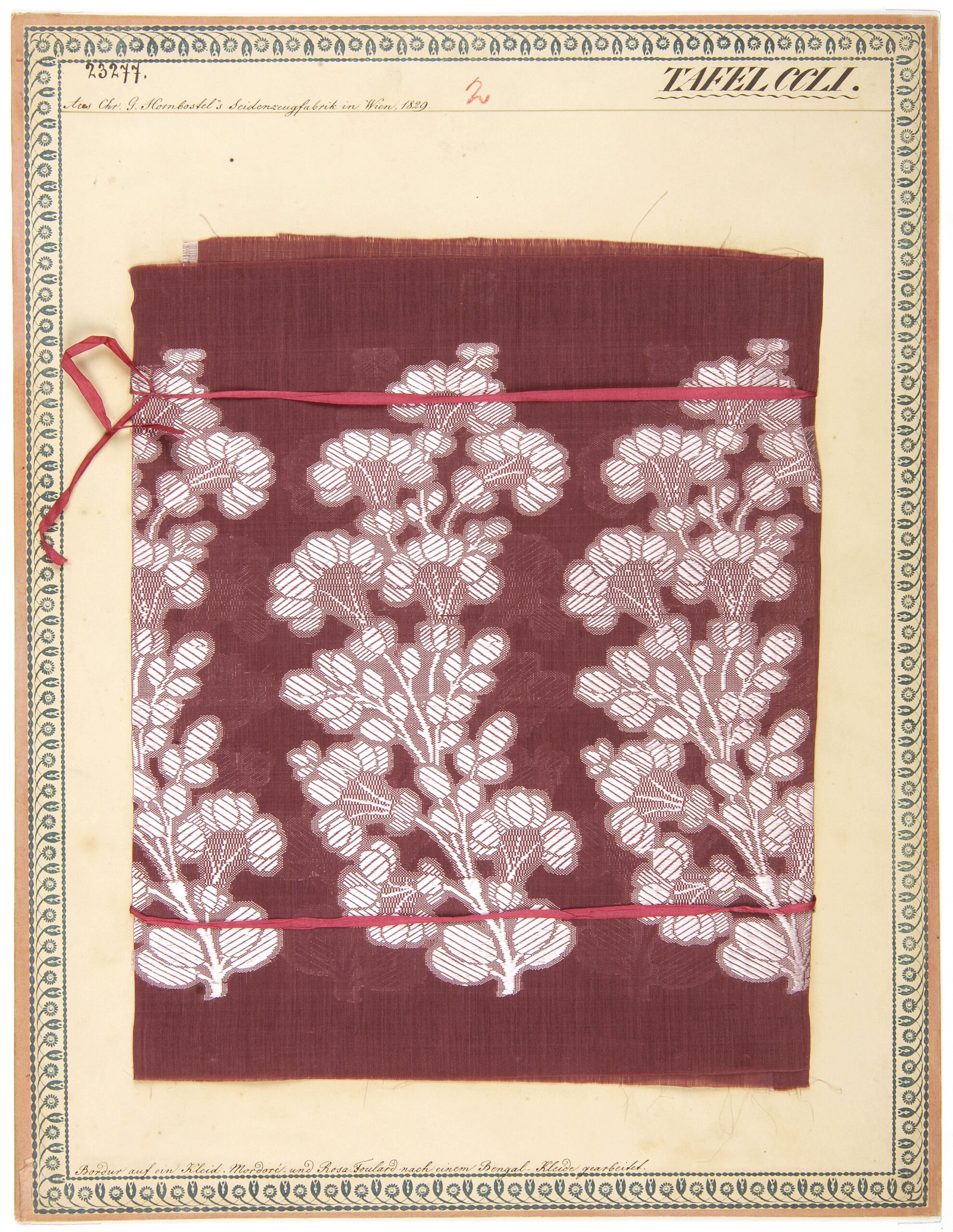 - Beschriftung (Vorderseite) : Aus Chr. G. Hornbostel's Seidenzeugfabrik in Wien, 1829. / Bordur auf ein Kleid. Mordoré- und Rosa-Foulard nach einem Bengal-Kleid gearbeitet
