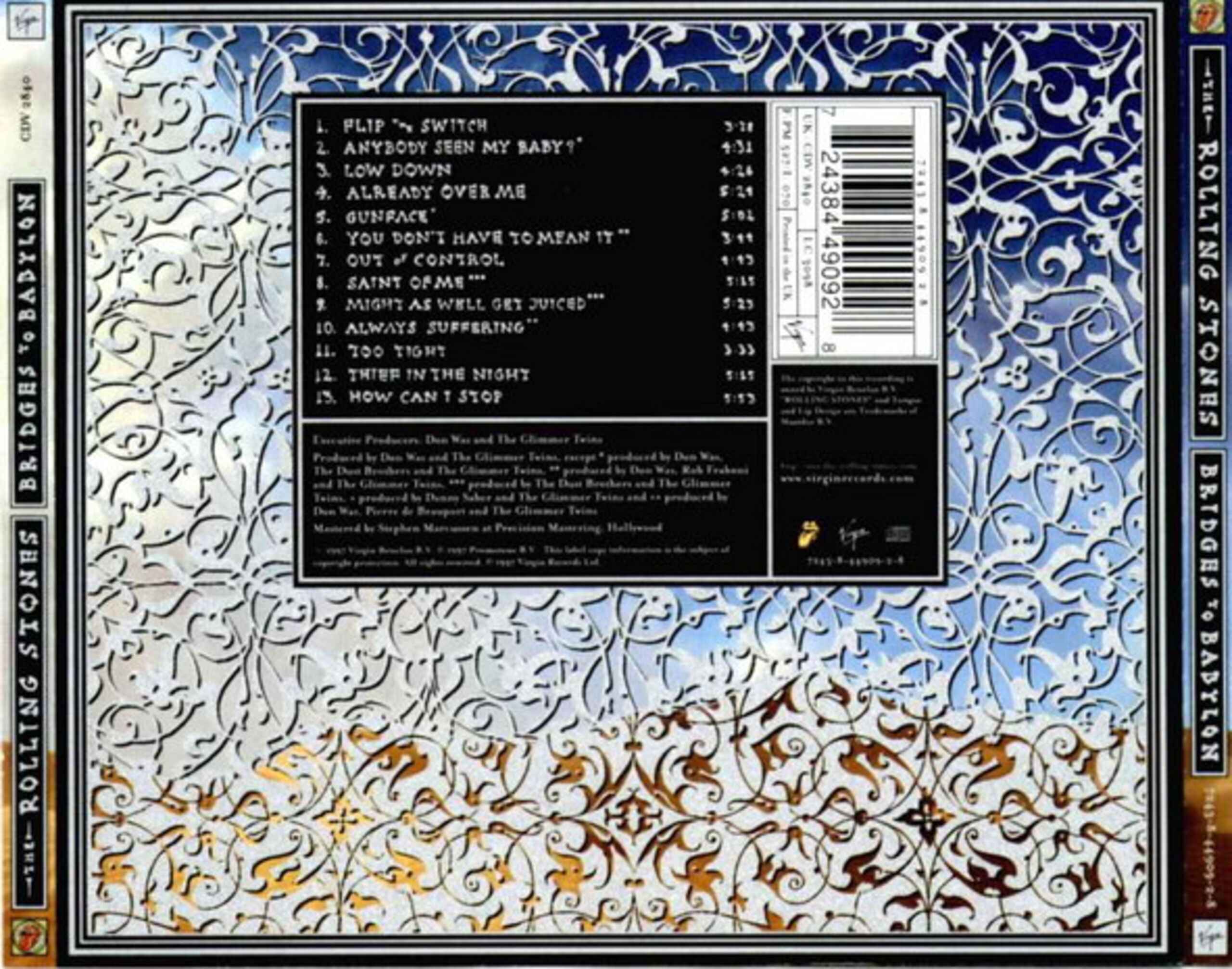 - Text am Objekt (Rückseite) : 1. Flip the Switch 3:28 / 2. Anybody seen my Baby? 4:31 / 3. Low Down 4:26 / 4. Already over me 5:24 / 5. Gunface 5:02 / 6. You don's have to mean it 3:44 / 7. Out of control 4:43 / 8. Sinat of me 5:15 / 9. Might as well get juiced 5:23 / 10. Always suffering 4:43 / (...) / Executive Producers: Don Was and The Glimmer Twins (...)