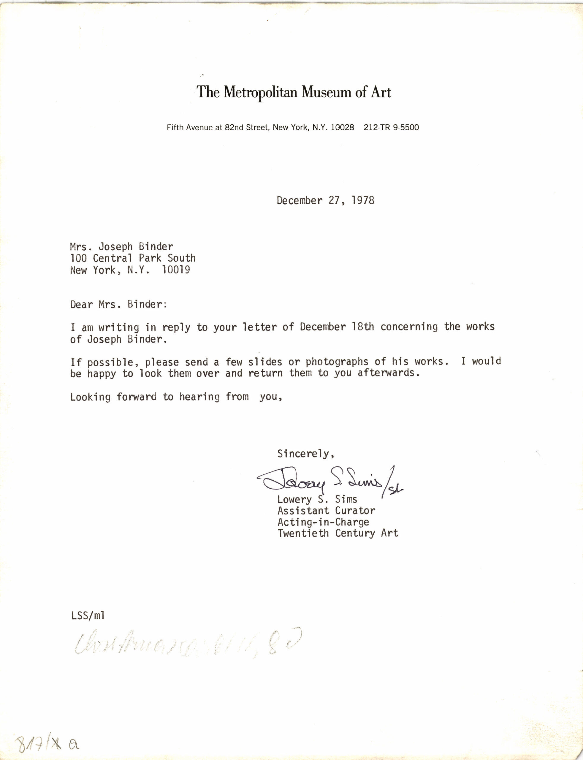 Korrespondenz, Brief vom "The Metropolitan Museum of Art" in New York, Lowery S. Sims, MAK Inv.nr. KI 14145-817-1