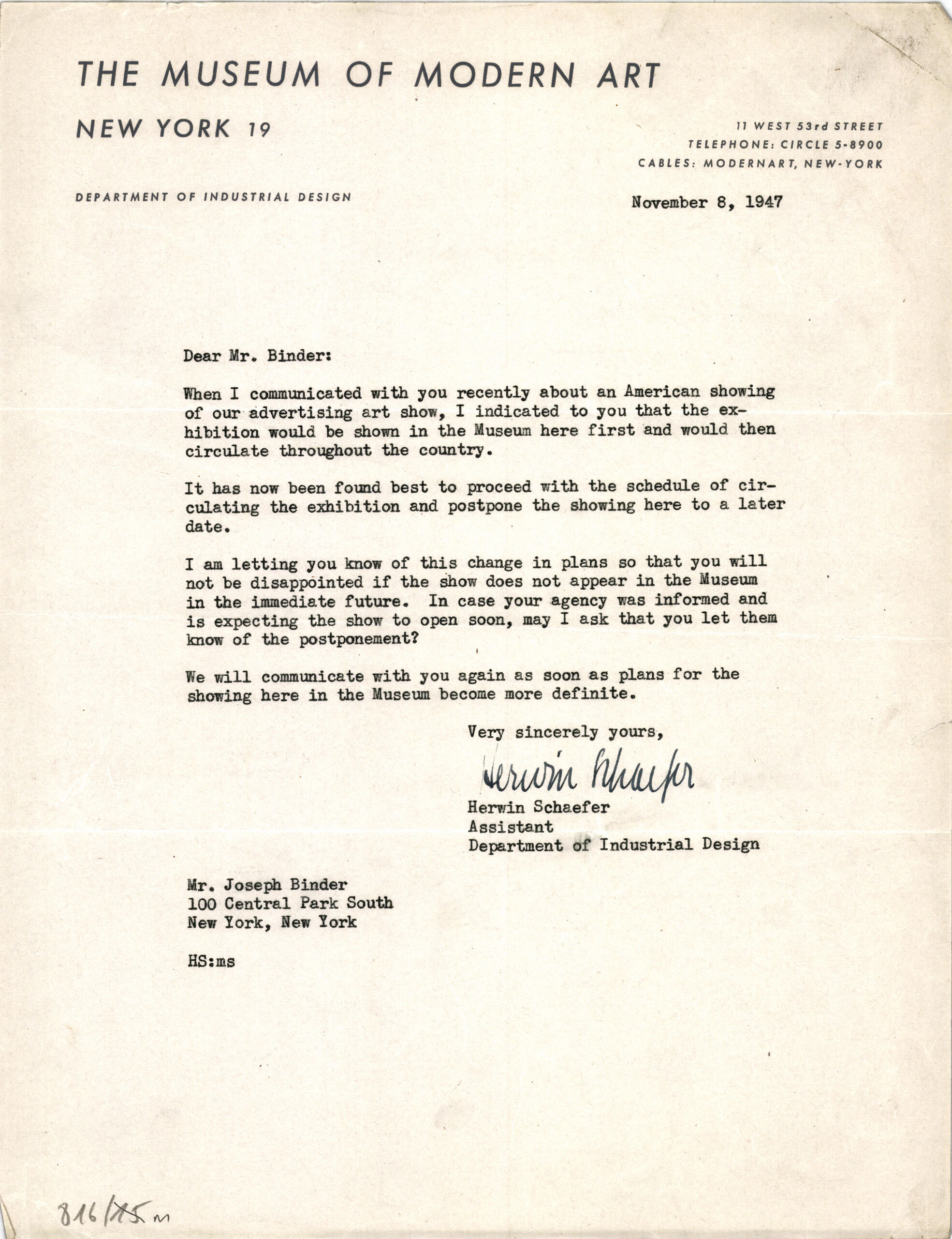 Korrespondenz, Brief vom "The Museum of Modern Art" in New York, Herwin Schaefer, MAK Inv.nr. KI 14145-816-13