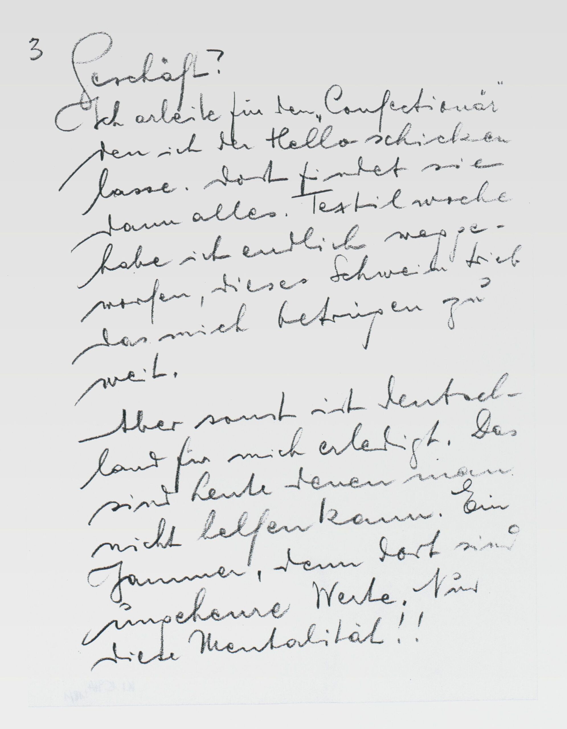 - : ... Geschäft?Ich arbeite für den „Concetionäre“ den ich der Hello schicken lasse. Dort findet sie dann alles. Textilwoche habe ich endliche weggeworden, dieses Schwein trieb das mich betrügen zu weit. Aber sonst ist Deutschland für mich erledigt. Das sind Leute denen man nicht helfen kann. Ein Jammer, denn dort sind ungeheure Werte. Nur diese Mentalität!! ....
