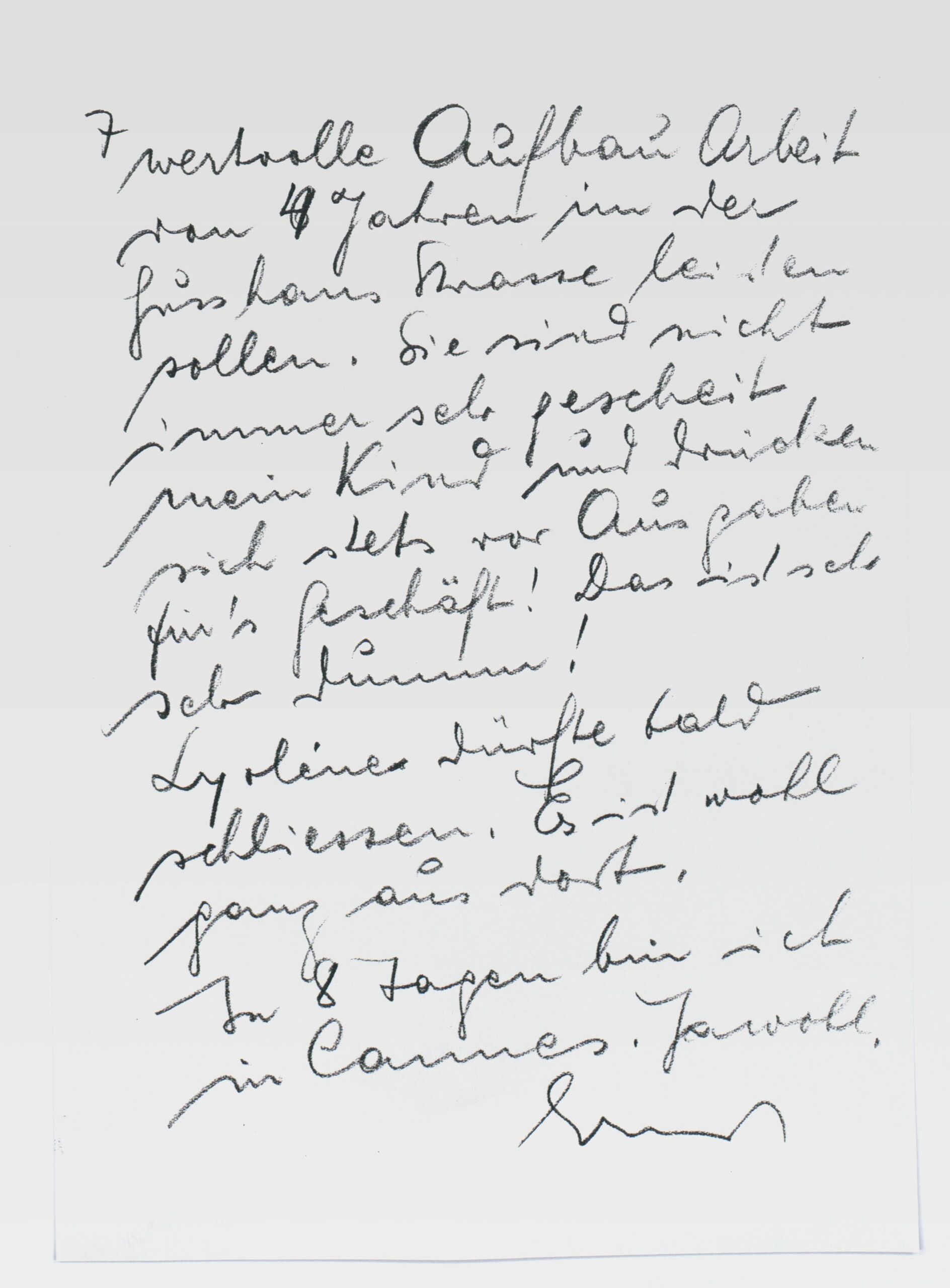 - : ... wertvolle Aufbauarbeit von 4 Jahren in der Gusshaus Straße leisten sollen. Sie sind nicht immer sehr gescheit mein Kind und drücken sich stets vor Ausgaben für’s Geschäft! Das ist sehr, sehr dumm!Lyoléne dürfte bald schließen. Es ist wohl ganz aus dort. In 8 Tagen bin ich in Cannes. Jawohl.Ernst ...