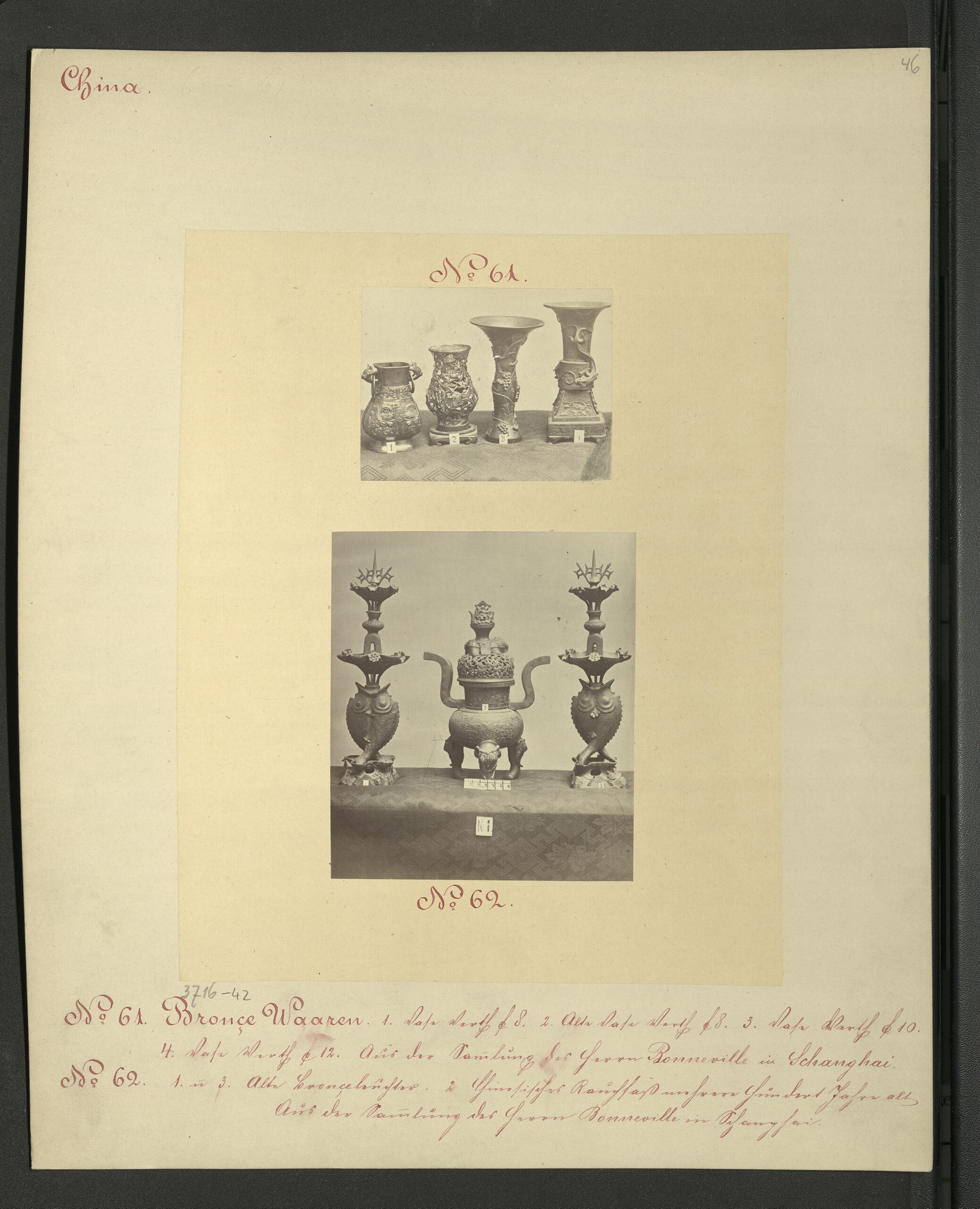 - Text am Objekt (Vorderseite) : [oben links] China.[unten] No. 61. Bronze Waaren. 1. Vase Werth F 8. 2. Alte Vase Werth F 8. 3. Vase Werth F 10. / 4. Vase Werth F 12. Aus der Sammlung des Herrn Bonneville in Schanghai. / No. 62. 1. u. 3. Alte Bronzeleuchter. 2. Chinesisches Rauchfaß mehrere hundert Jahre alt / Aus der Sammlung des Herrn Bonneville in Schanghai.