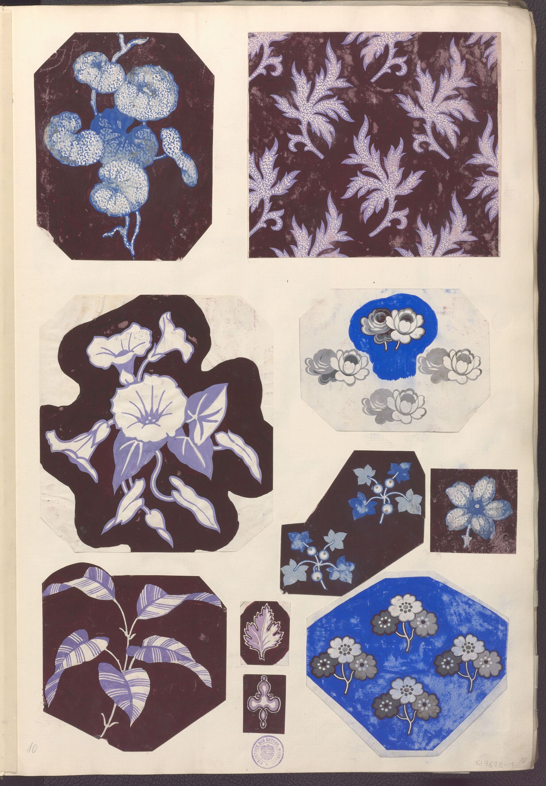 Tapetenentwurf, Buchseite mit 10 Ornamententwürfen aus einem Sammelband mit Originalzeichnungen für Stoff- und Tapetenmuster, Anonym, MAK Inv.nr. KI 7678-1