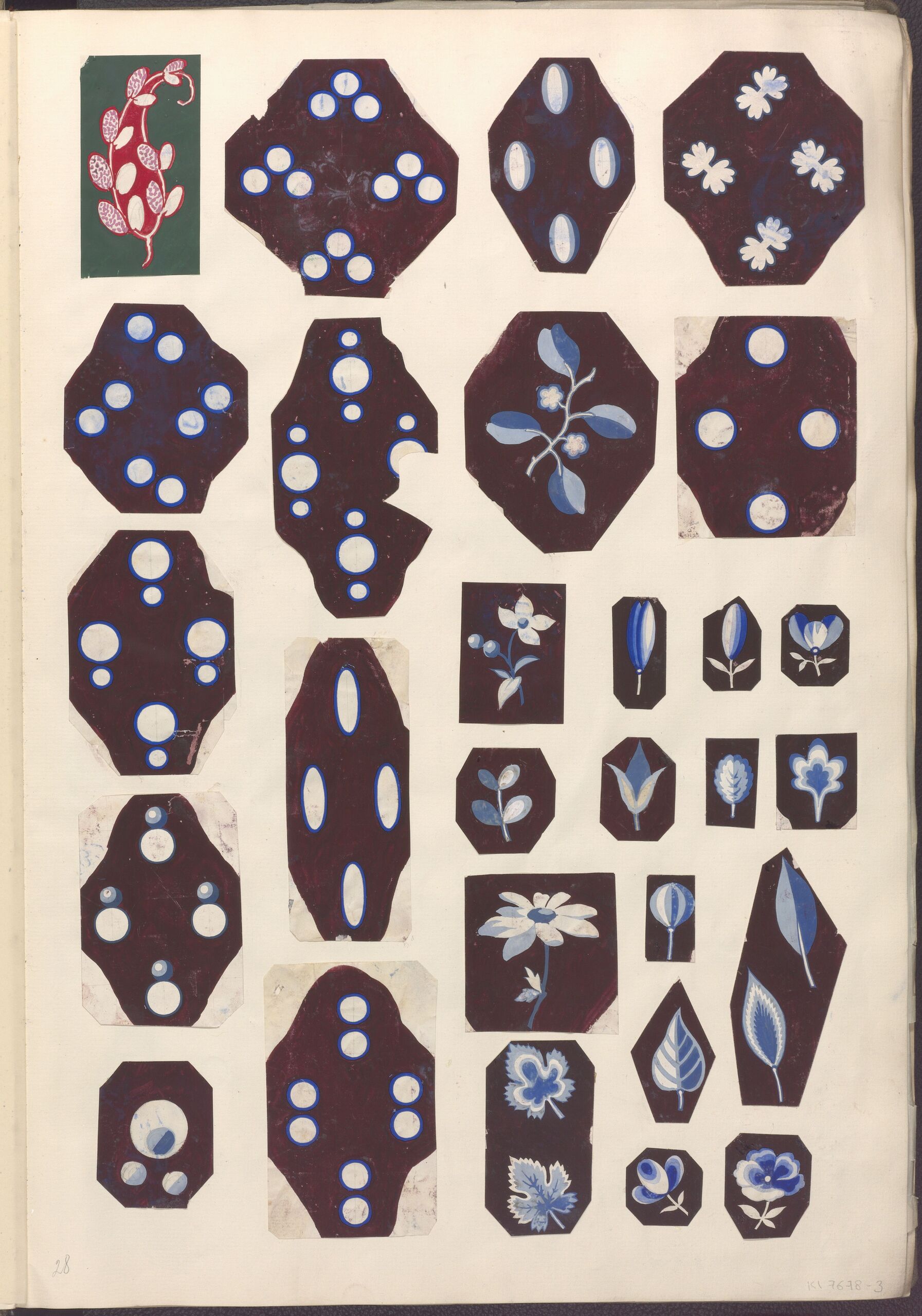 Tapetenentwurf, Buchseite mit 28 Ornamententwürfen aus einem Sammelband mit Originalzeichnungen für Stoff- und Tapetenmuster, Anonym, MAK Inv.nr. KI 7678-3