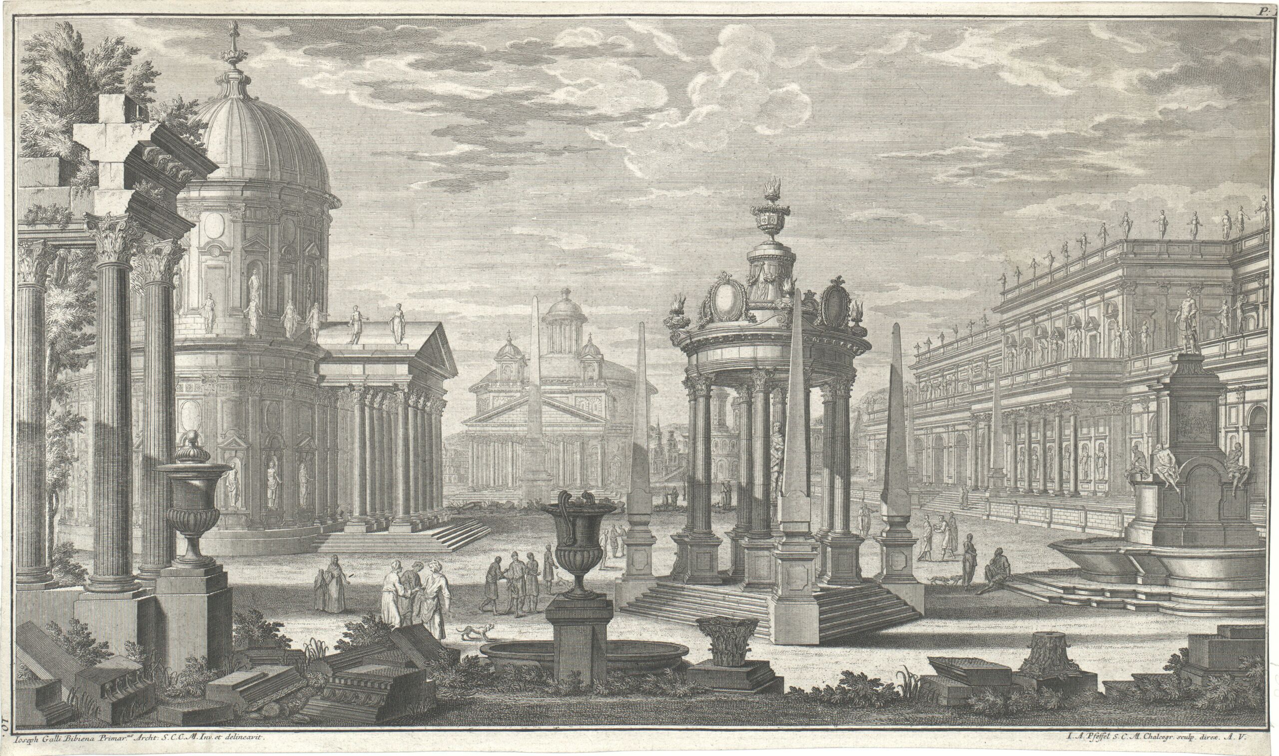 - Text am Objekt: Ioseph Galli Bibiena Primar.us Archit. S. C. C. M. Inv. et delineavit. / I. A. Pfeffel S. C. M. Chalcogr. sculp. direx. A. V. / 10
