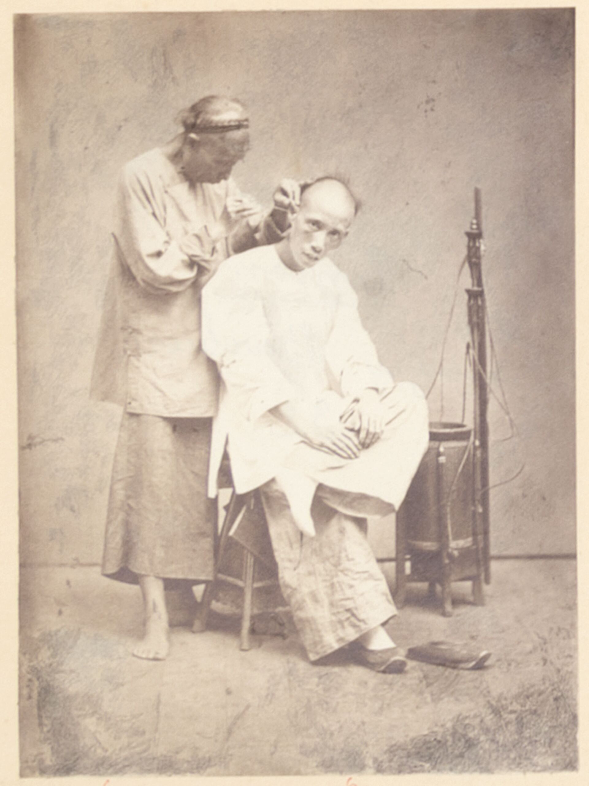 - Text am Objekt: [Blatt, mittig oben]: CHINA.[Blatt, mittig unten]: Chinesischer Barbier.[Blatt, links unten]: Nach der Natur photographirt[Blatt, rechts unten]: von Wilhelm Burger.