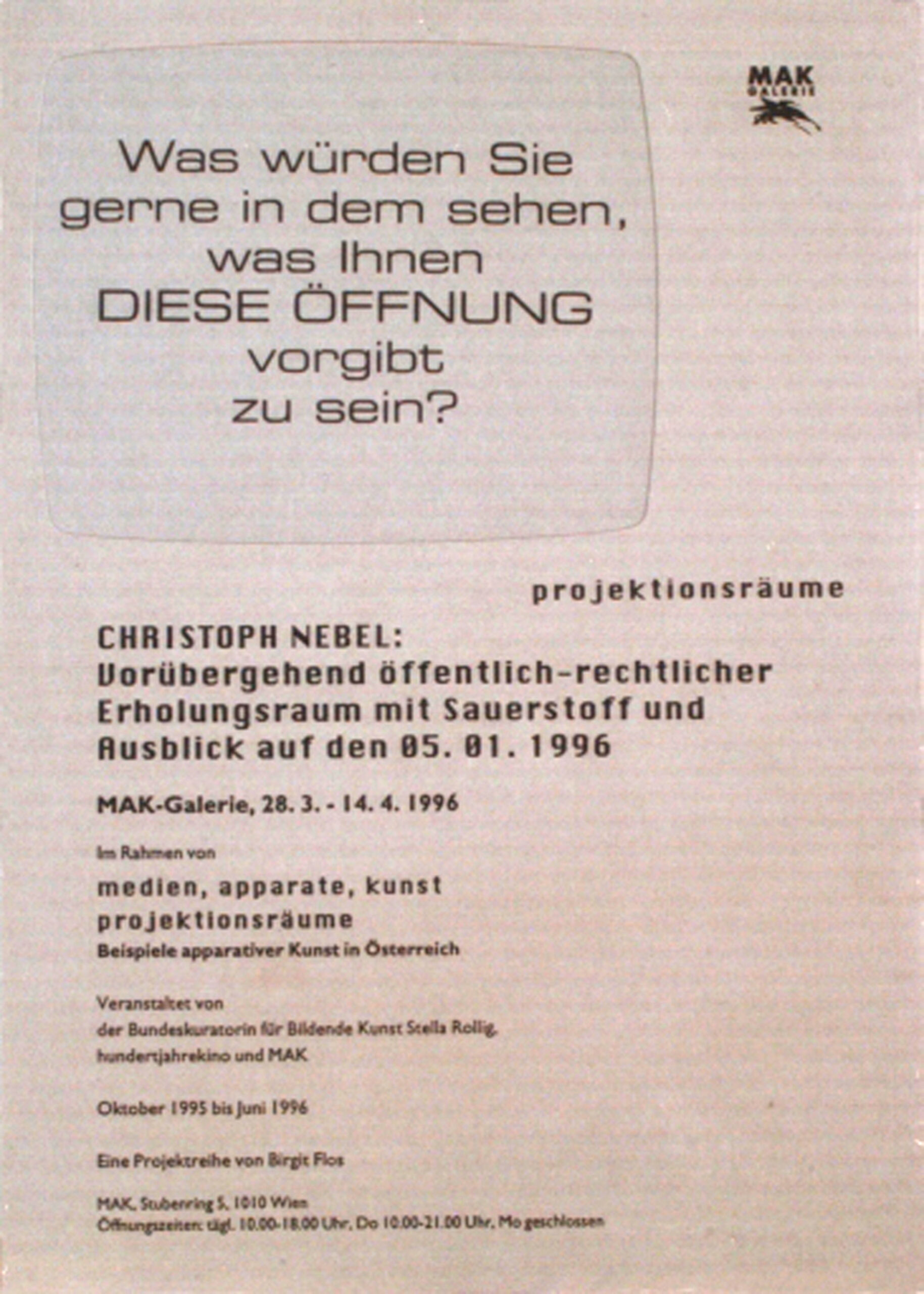 - Text am Objekt: Medien, Apparate, Kunst. Projektionsräume. Was würden sie gerne in dem sehnen, was Ihnen diese Öffnung vorgibt zu sein? Christoph Nebel: Vorübergehend öffentlich-rechtlicher Erholungsraum mit Sauerstoff und Ausblick auf den 05. 01.1196. 28.3. - 14.4.1996. MAK Galerie