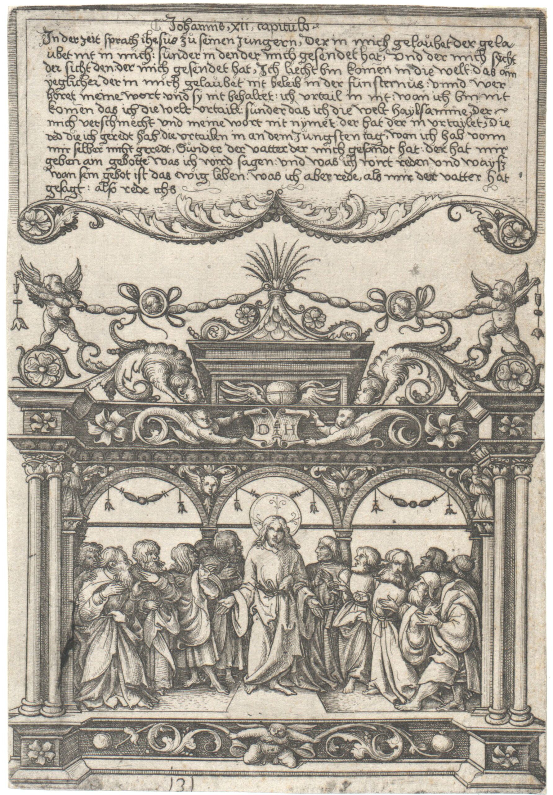 Druckgrafik, Christus mit den Jüngern, darüber eine Kartusche mit einem Auszug aus dem 12. Kapitel des Johannesevangeliums, mit Funck- Nummer 131, Daniel Hopfer, MAK Inv.nr. KI 1-103
