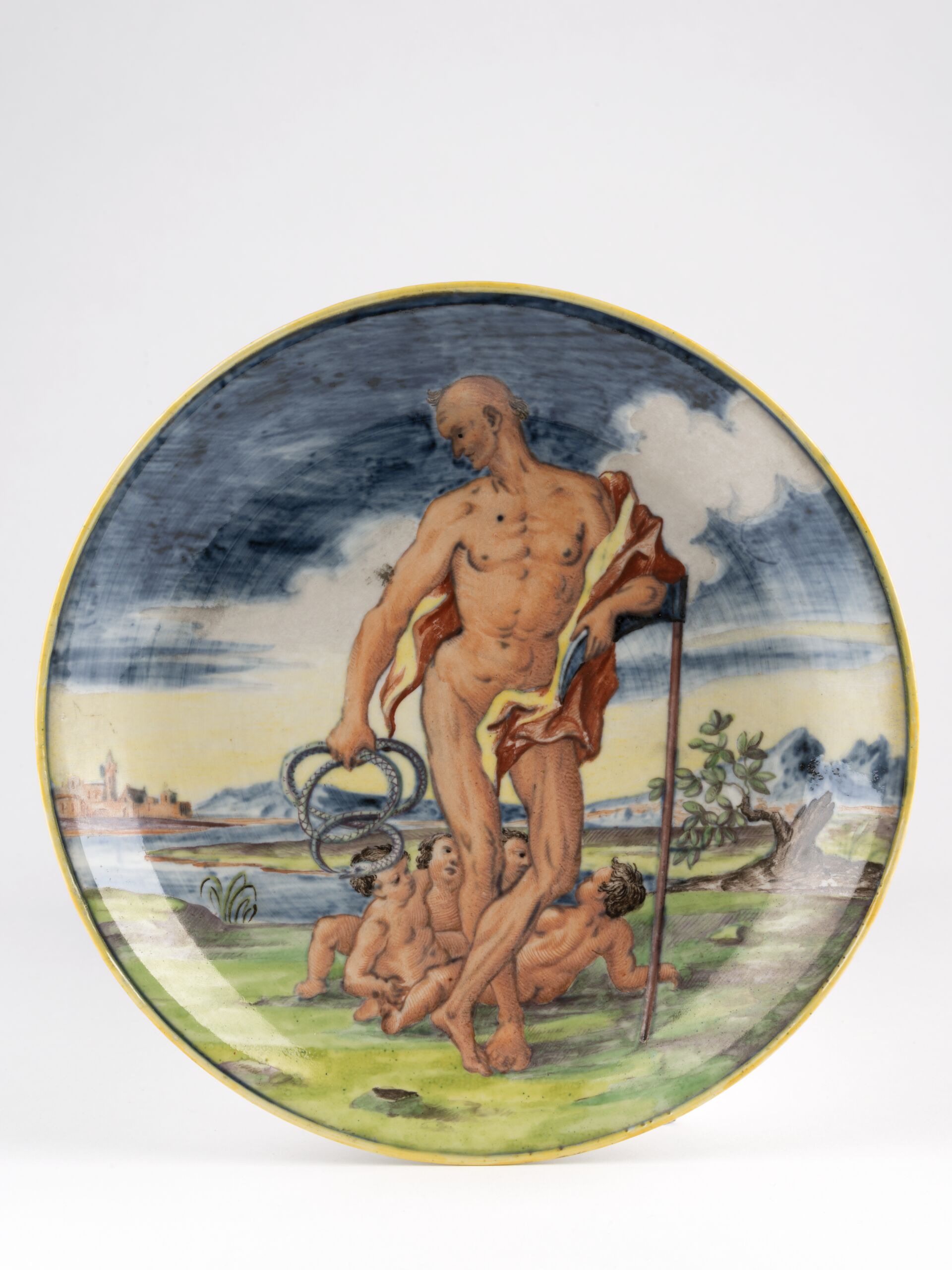 Teller mit farbigem Dekor nach Majolika-Art, Chronos auf einen Stock gestützt und eine Schlange in der rechten Hand haltend in einer Flußlandschaft mit einer kleinen Ortschaft und Gebirgszügen im Hintergrund, hinter Chronos eine Gruppe Putti am Boden sitzend
