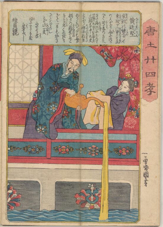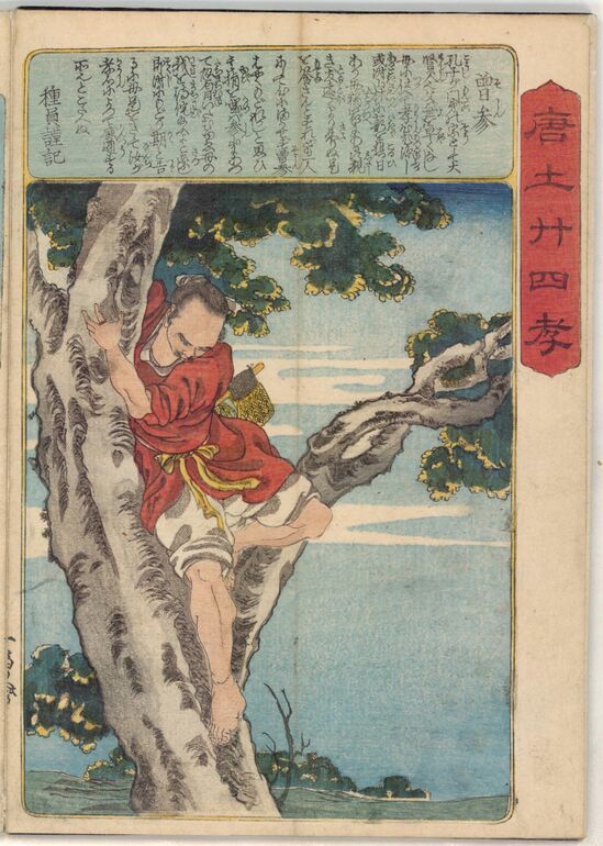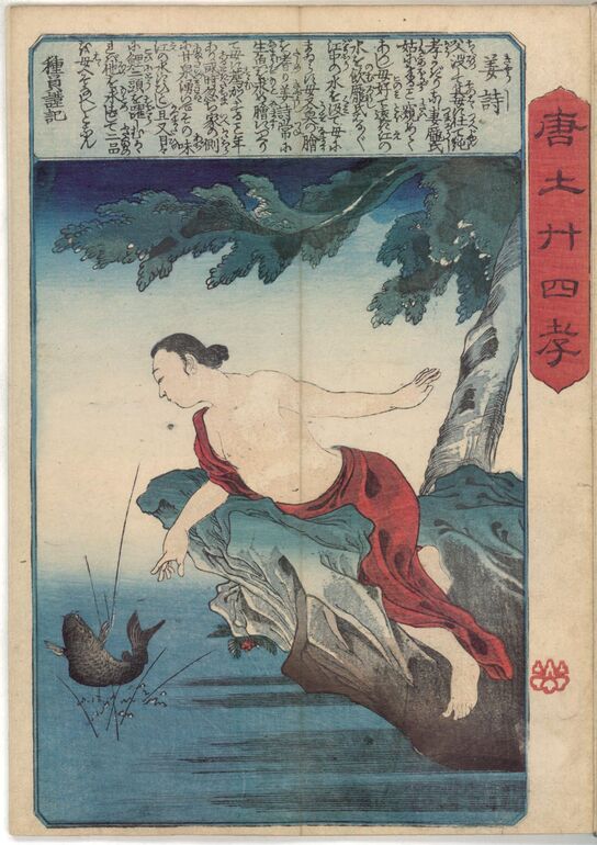 Album von Utagawa Kuniyoshi über die 24 chinesischen Vorbilder der kindlichen Pietät mit Texten des bekannten gesaku 戯作-Schriftstellers Ryūkatei Tanekazu 柳下亭種員(1807–1858). Das Bild zeigt Chūyū 仲由 (Chung Yu), der zum Wohl seiner Eltern Säcke voll Reis auf seinem Rücken trägt.