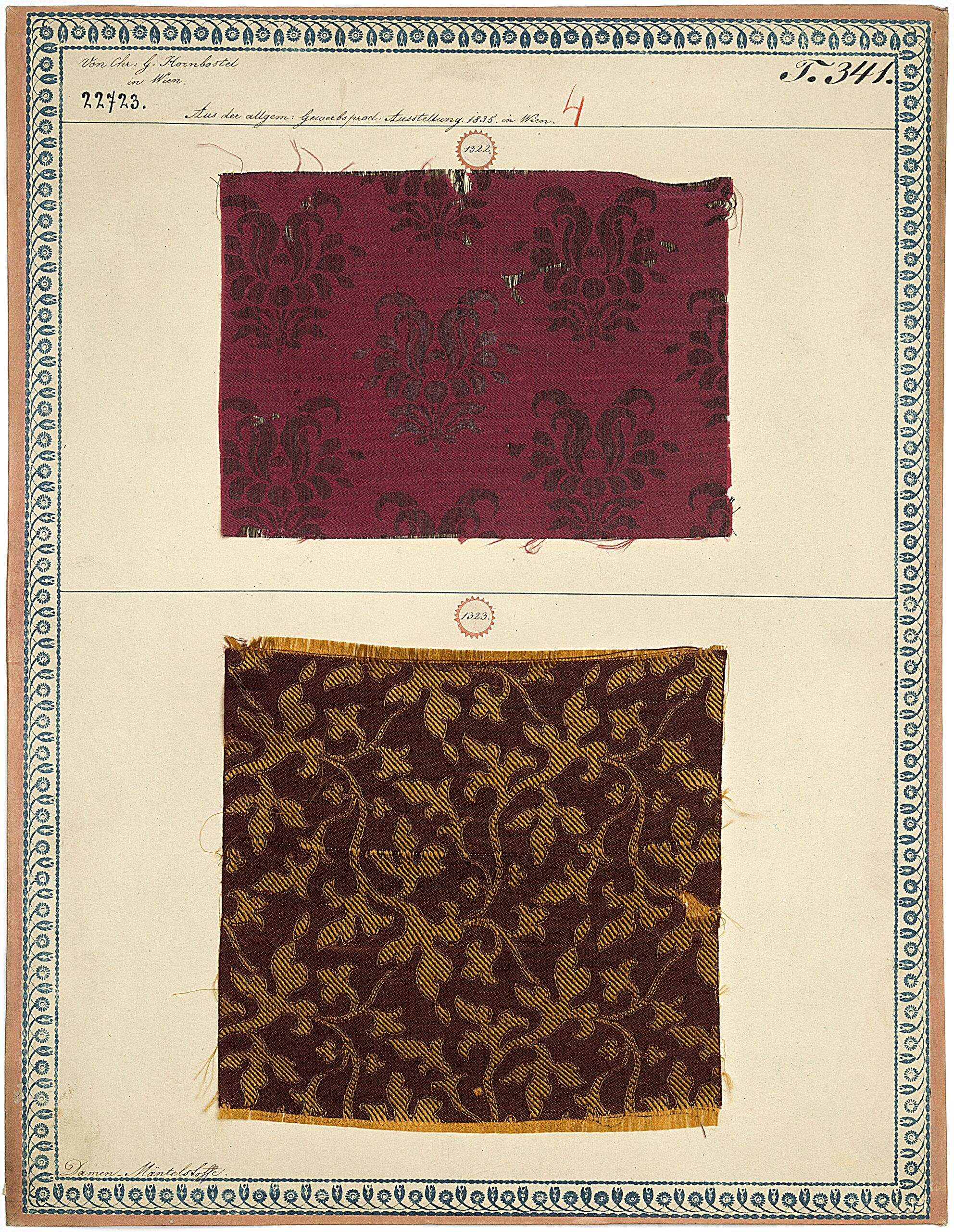 - Beschriftung (Vorderseite) : Von Chr. G. Hornbostel in Wien. / Aus der allgem. Gewerbsprod.-Ausstellung in Wien 1835. / Damen-Mäntelstoffe.